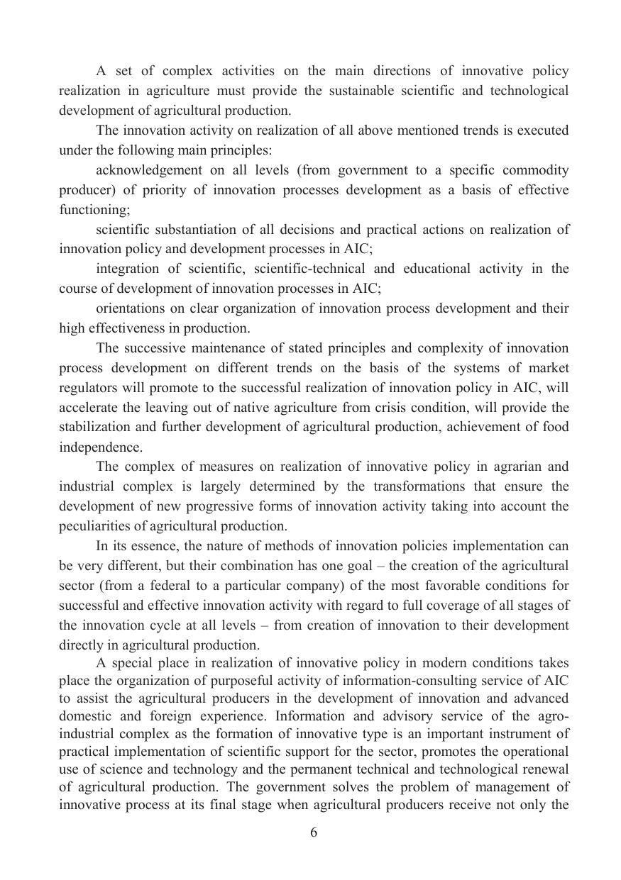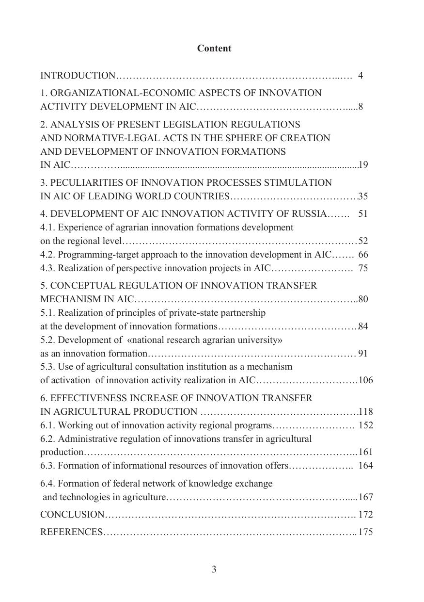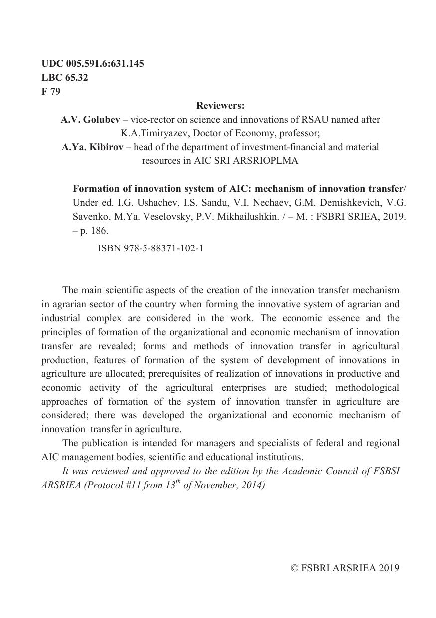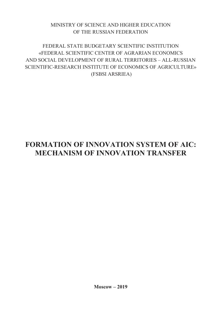 The main scientific aspects of the creation of the innovation transfer mechanism in agrarian sector of the country when forming the innovative system of agrarian and industrial complex are considered in the work. The economic essence and the principles of formation of the organizational and economic mechanism of innovation transfer are revealed; forms and methods of innovation transfer in agricultural production, features of formation of the system of development of innovations in agriculture are allocated; prerequisites of realization of innovations in productive and economic activity of the agricultural enterprises are studied; methodological approaches of formation of the system of innovation transfer in agriculture are considered; there was developed the organizational and economic mechanism of innovation transfer in agriculture. The publication is intended for managers and specialists of federal and regional AIC management bodies, scientific and educational institutions.