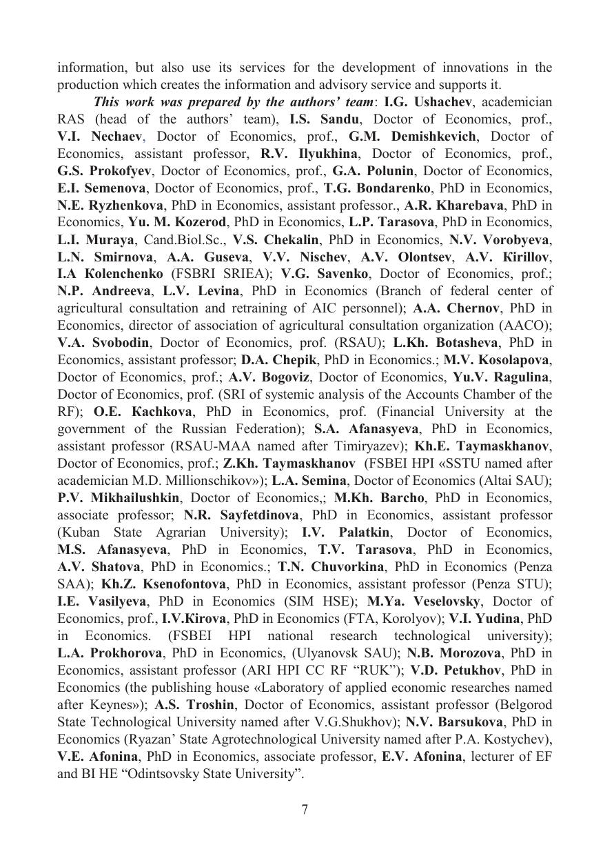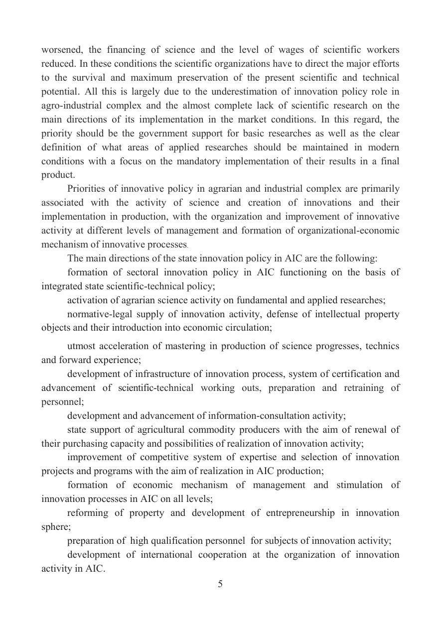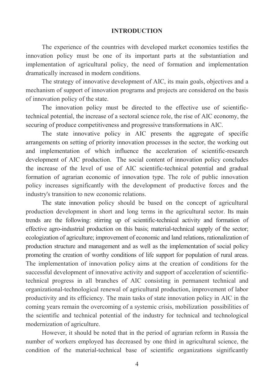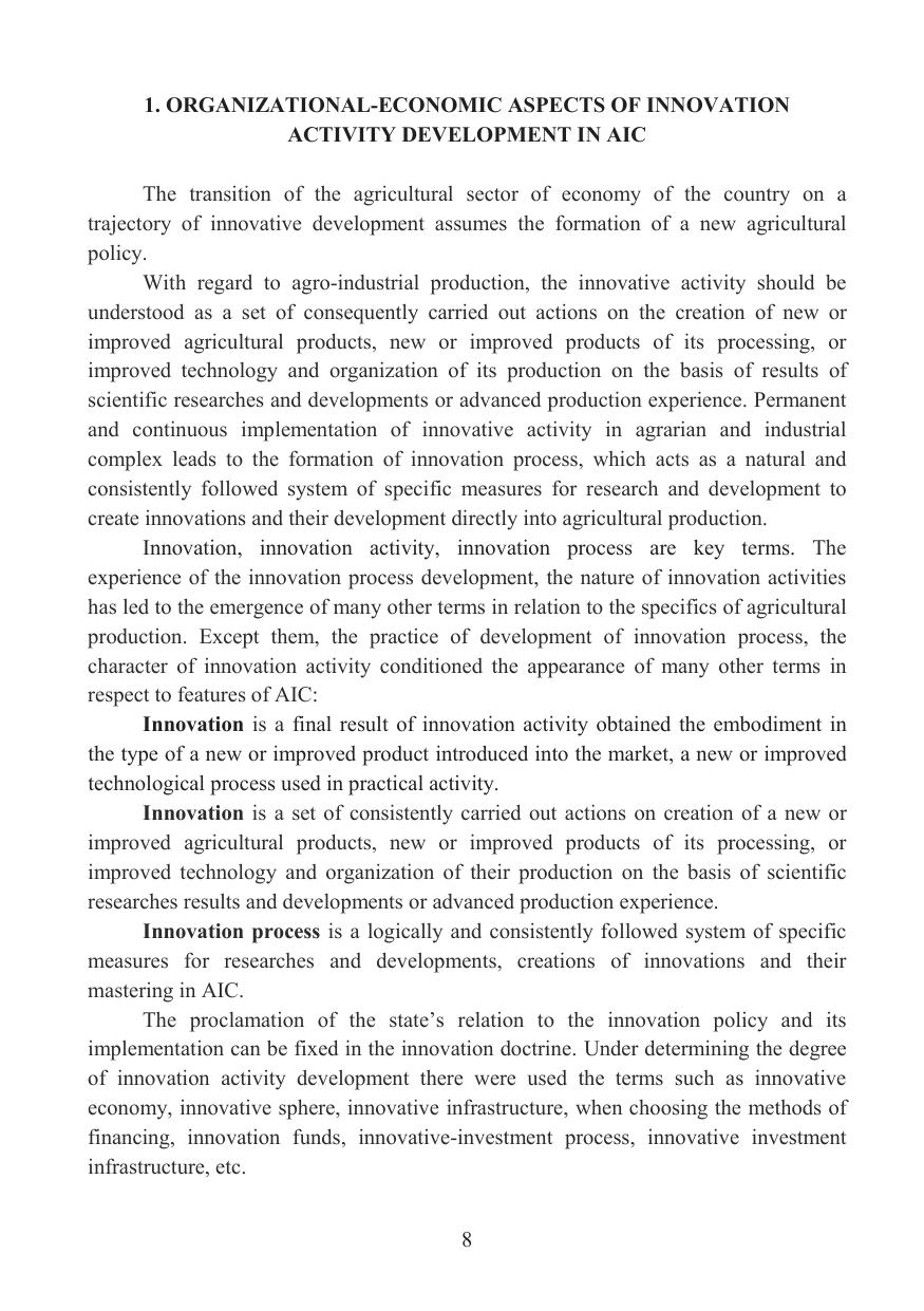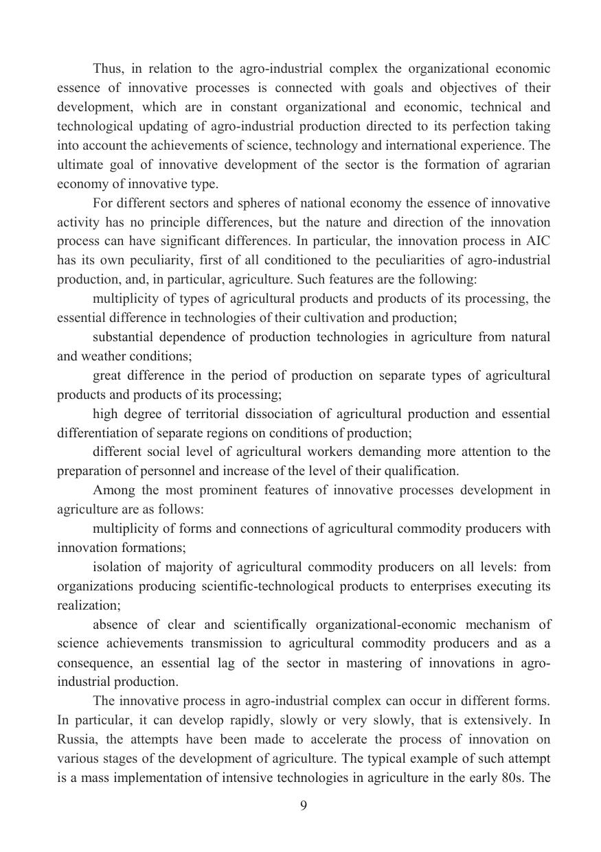 The main scientific aspects of the creation of the innovation transfer mechanism in agrarian sector of the country when forming the innovative system of agrarian and industrial complex are considered in the work. The economic essence and the principles of formation of the organizational and economic mechanism of innovation transfer are revealed; forms and methods of innovation transfer in agricultural production, features of formation of the system of development of innovations in agriculture are allocated; prerequisites of realization of innovations in productive and economic activity of the agricultural enterprises are studied; methodological approaches of formation of the system of innovation transfer in agriculture are considered; there was developed the organizational and economic mechanism of innovation transfer in agriculture. The publication is intended for managers and specialists of federal and regional AIC management bodies, scientific and educational institutions.
