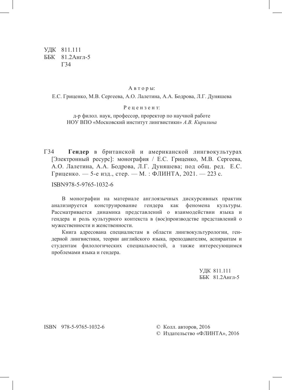 Книга адресована специалистам в области лингвокультурологии, гендерной лингвистики, теории английского языка, преподавателям, аспирантам и студентам филологических специальностей, а также интересующимся проблемами языка и гендера.