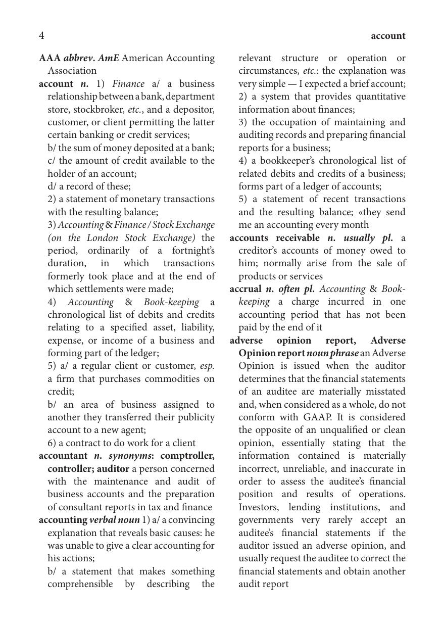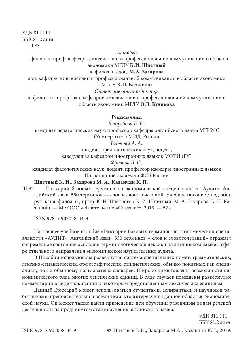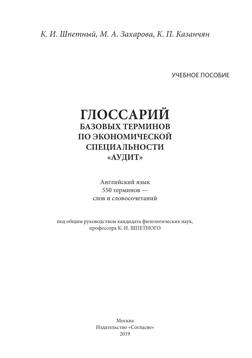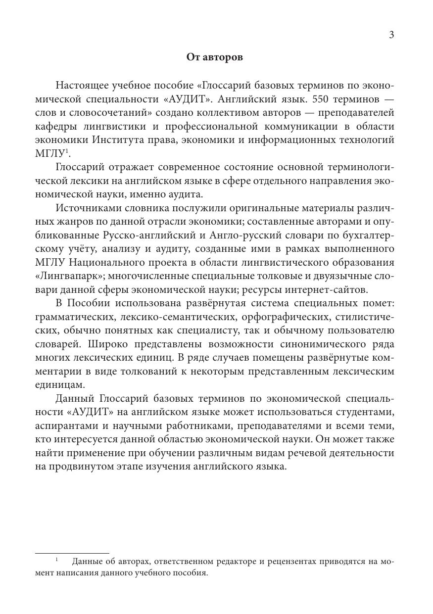 Настоящее учебное пособие «Глоссарий базовых терминов по экономической специальности «АУДИТ». Английский язык. 550 терминов – слов и словосочетаний» отражает современное состояние основной терминологической лексики на английском языке в сфере отдельного направления экономической науки, именно аудита. В Пособии использована развёрнутая система специальных помет: грамматических, лексико-семантических, орфографических, стилистических, обычно понятных как специалисту, так и обычному пользователю словарей. Широко представлены возможности синонимического ряда многих лексических единиц. В ряде случаев помещены развёрнутые комментарии в виде толкований к некоторым представленным лексическим единицам. Данный Глоссарий может использоваться студентами, аспирантами и научными работниками, преподавателями и всеми теми, кто интересуется данной областью экономической науки. Он может также найти применение при обучении различным видам речевой деятельности на продвинутом этапе изучения английского языка.
