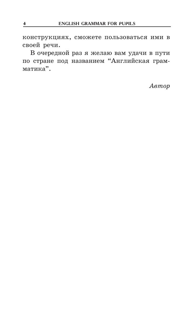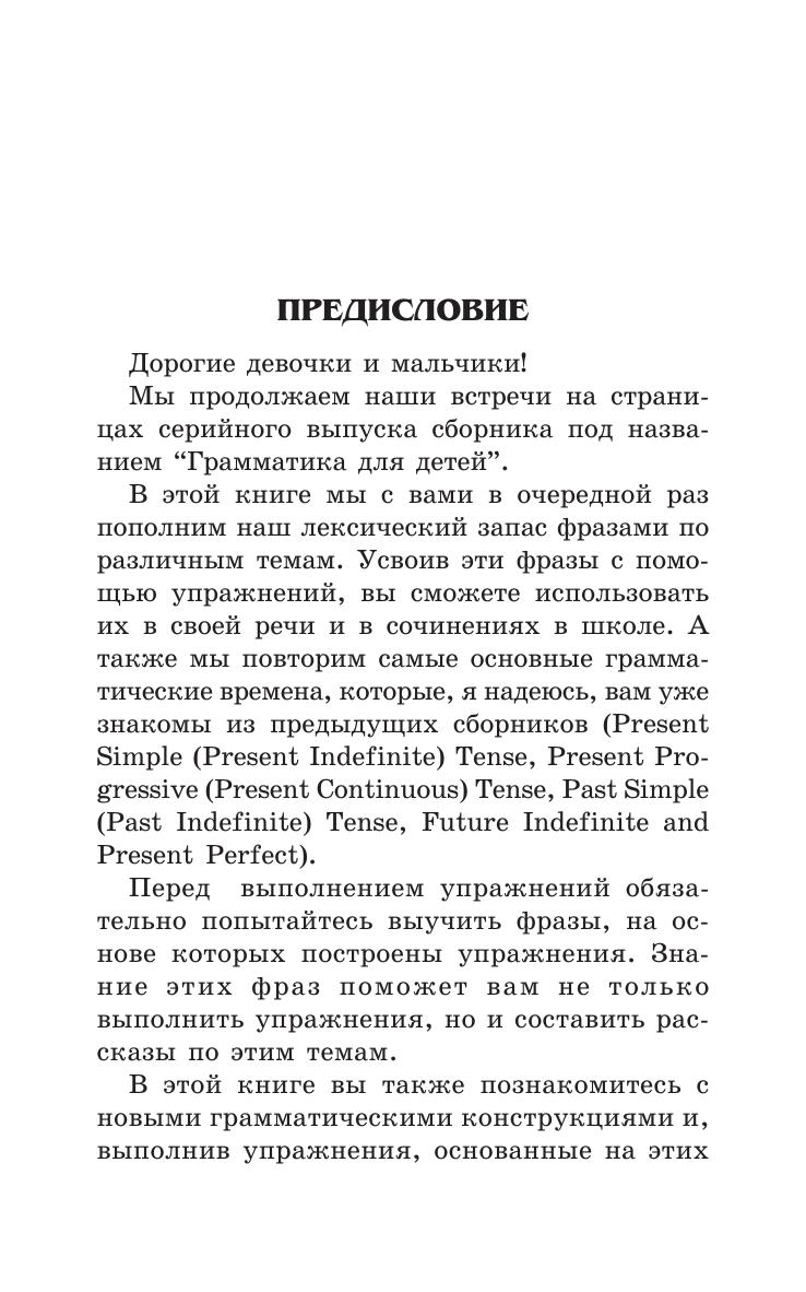 Предлагаемый сборник упражнений является пособием для изучения и закрепления основ грамматики английского языка. Лексические и грамматические темы в этом сборнике частично дополняют объем учебника И. Н. Верещагиной (IV). Сборник может быть использован как дополнительный лексический и грамматический материал в классах, работающих по программе И. Н. Верещагиной и по другим учебникам и программам. Сборник оснащен таблицами по всем изучаемым и закрепляемым грамматическим временам. Пособие рассчитано на школьников средних классов общеобразовательных и специальных школ. Тематический лексический материал может быть использован преподавателями для подготовки учащихся к творческим работам. В книгу также включен словарь, основанный на материале, использованном в книге.