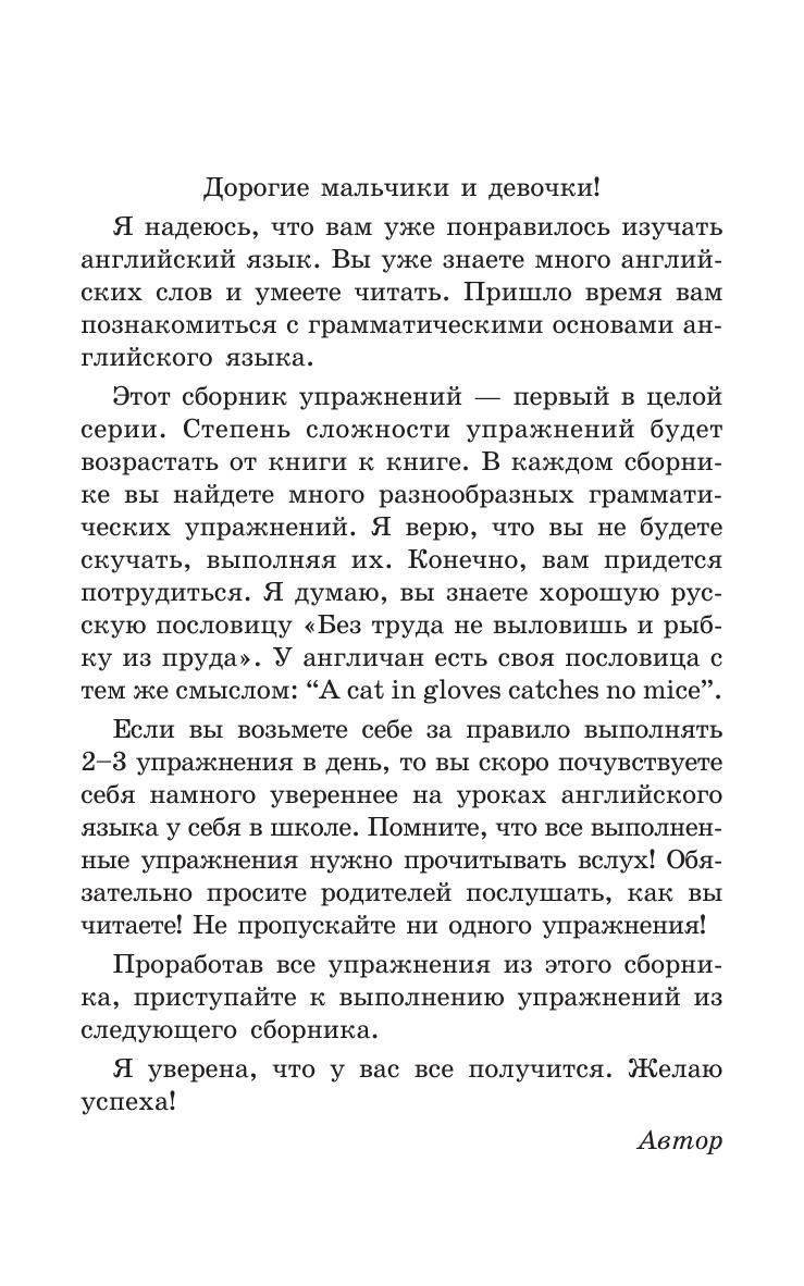 Предлагаемый сборник упражнений является пособием для изучения и закрепления основ грамматики английского языка. Большой объем заданий позволит четко усвоить лексический и грамматический материал. Пособие рассчитано на школьников младших и средних классов общеобразовательных и специальных школ. Помимо обычного словаря в книгу включен тематический лексический минимум