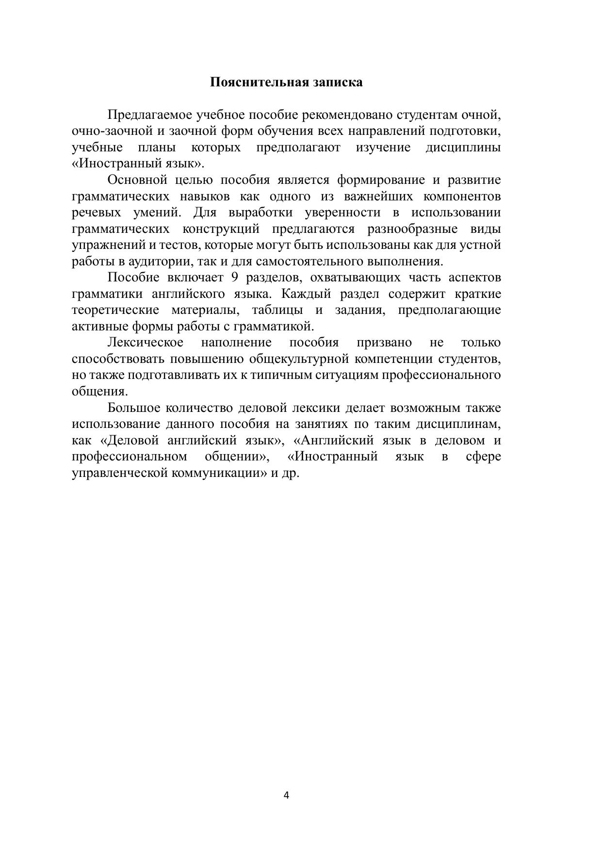 Основной целью настоящего учебного пособия является формирование и развитие грамматических навыков как одного из важнейших компонентов речевых умений. Предлагаются разнообразные виды упражнений и тестов, которые могут быть использованы как для устной работы в аудитории, так и для самостоятельного выполнения. Лексическое наполнение пособия призвано не только способствовать повышению общекультурной компетенции студентов, но и подготовить их к типичным ситуациям профессионального общения.