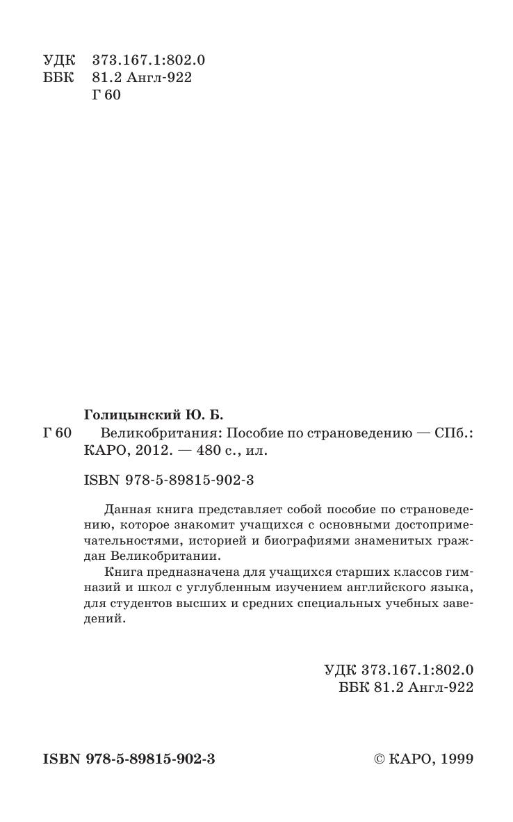 Данная книга представляет собой пособие по страноведению, которое знакомит учащихся с основными достопримечательностями, историей и биографиями знаменитых граждан Великобритании. Книга предназначена для учащихся старших классов гимназий и школ с углубленным изучением английского языка, для студентов высших и средних специальных учебных заведений.