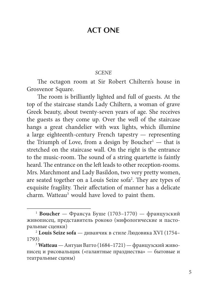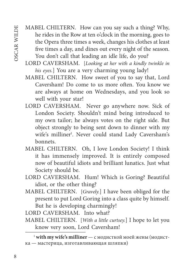 Оскар Уайльд (1854–1900) — английский писатель, досконально изучивший все подводные камни семейной жизни.В самой известной своей пьесе он предоставляет читателю право самому ответить на живо трепещущие вопросы: следует ли безоговорочно доверять своей второй половине? Надо ли идеализировать спутника жизни или лучше принимать его со всеми недостатками? Прощать за ошибки, совершенные в прошлом, или безжалостно осуждать, сокрушая то, что строилось годами?Красивый язык, парадоксальные, но и логичные высказывания, мягкий юмор, запутанность положений заставят читателя вновь и вновь обращаться к этой книге, а комментарии и словарик помогут ему в полной мере оценить прелесть и афористичность языка.В книге приводится неадаптированный текст на языке оригинала с комментариями и словарем.