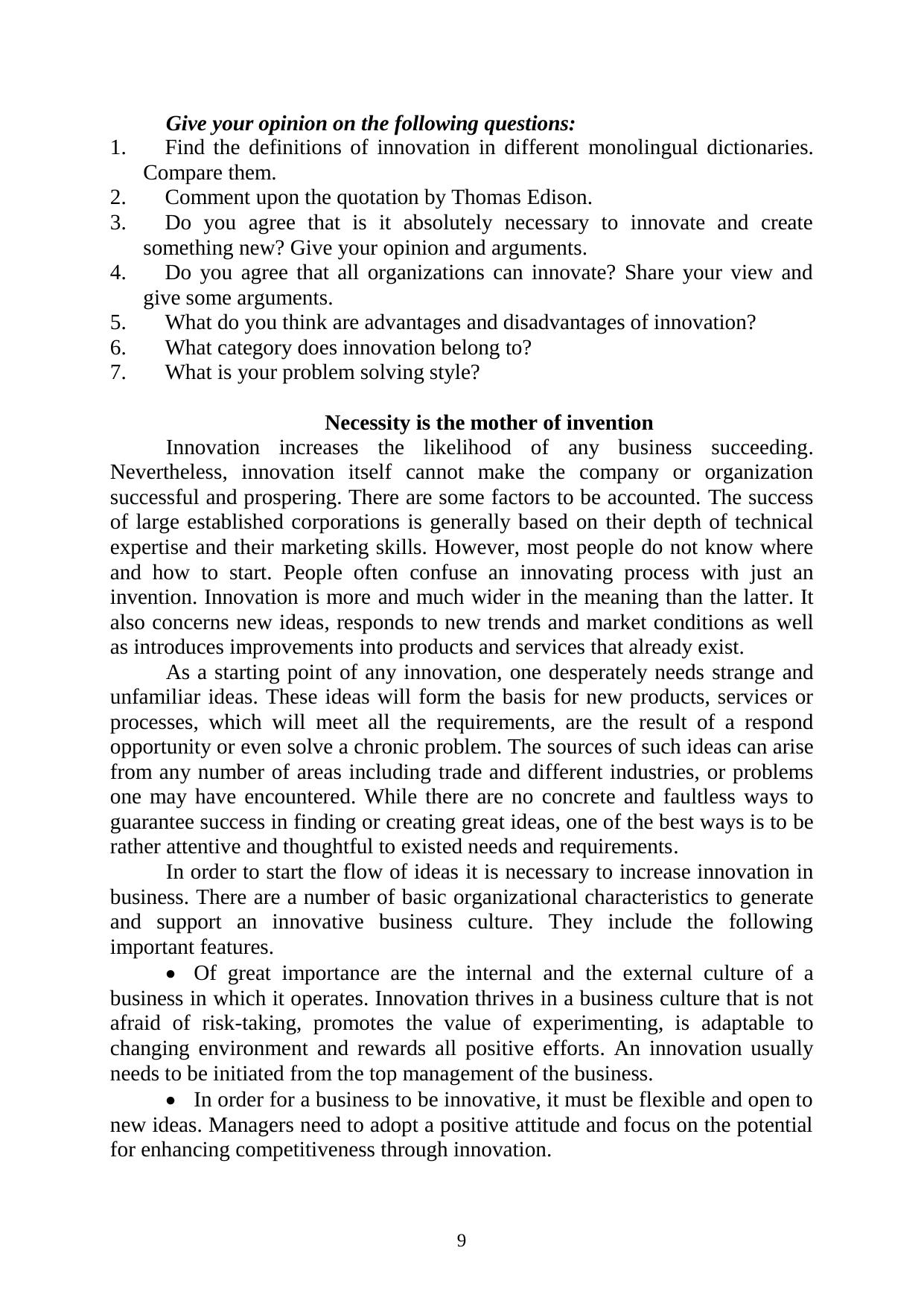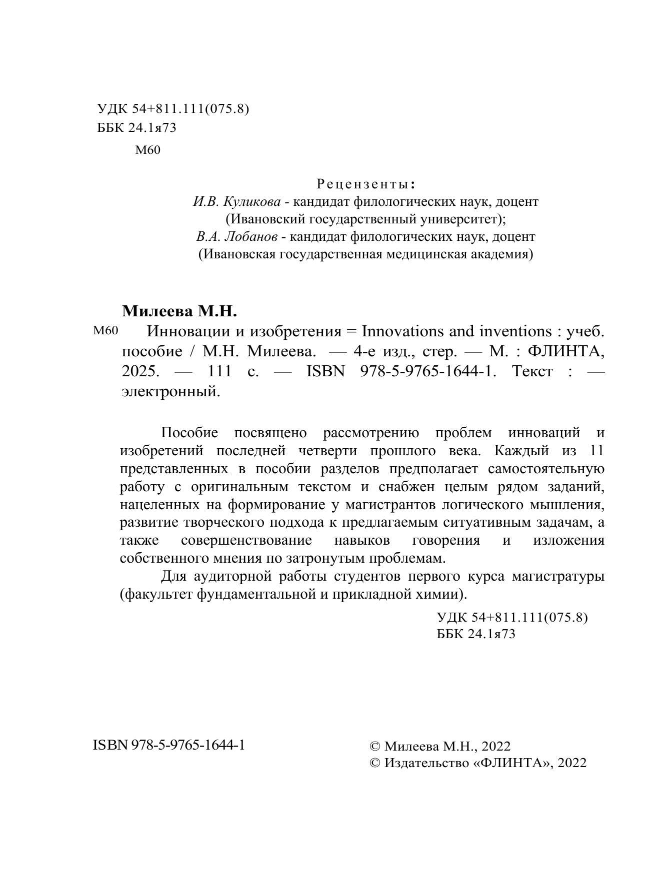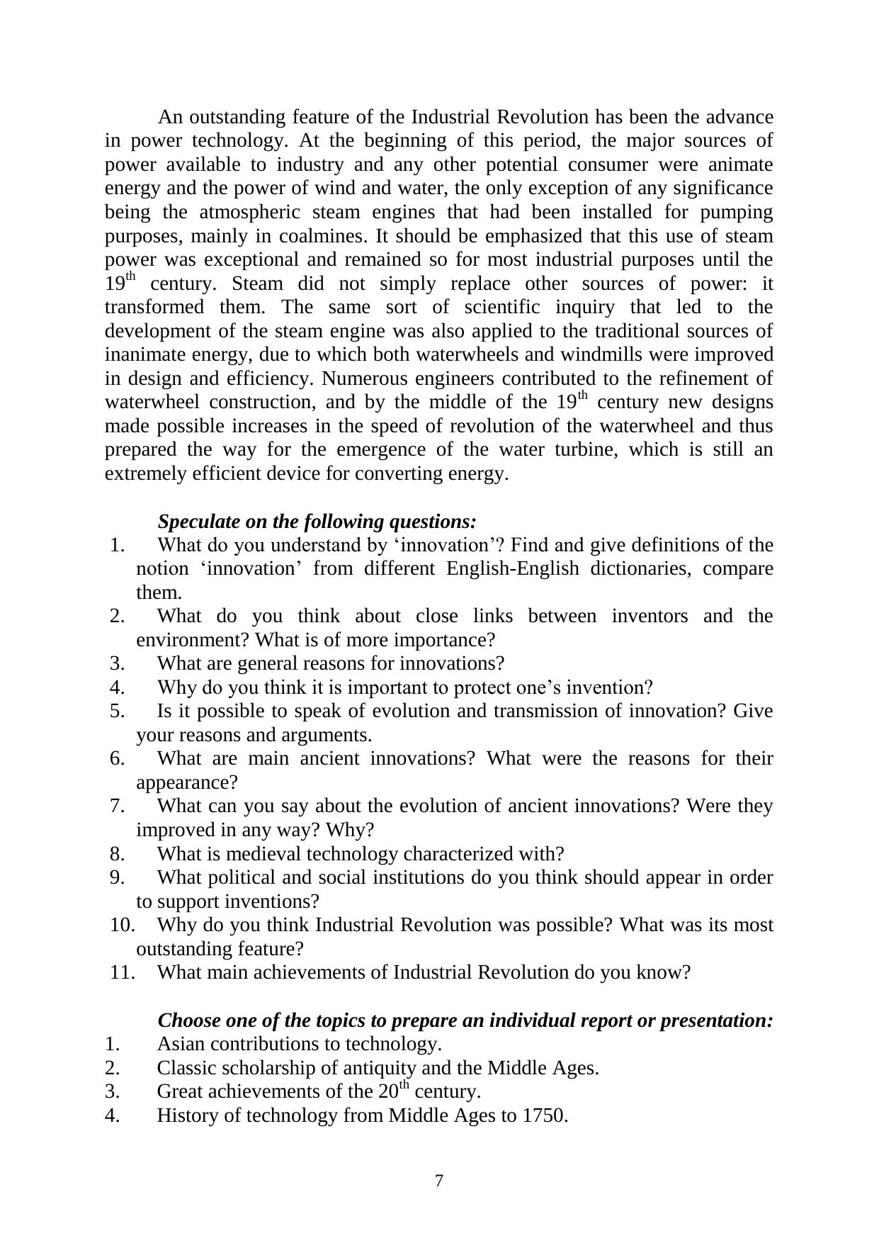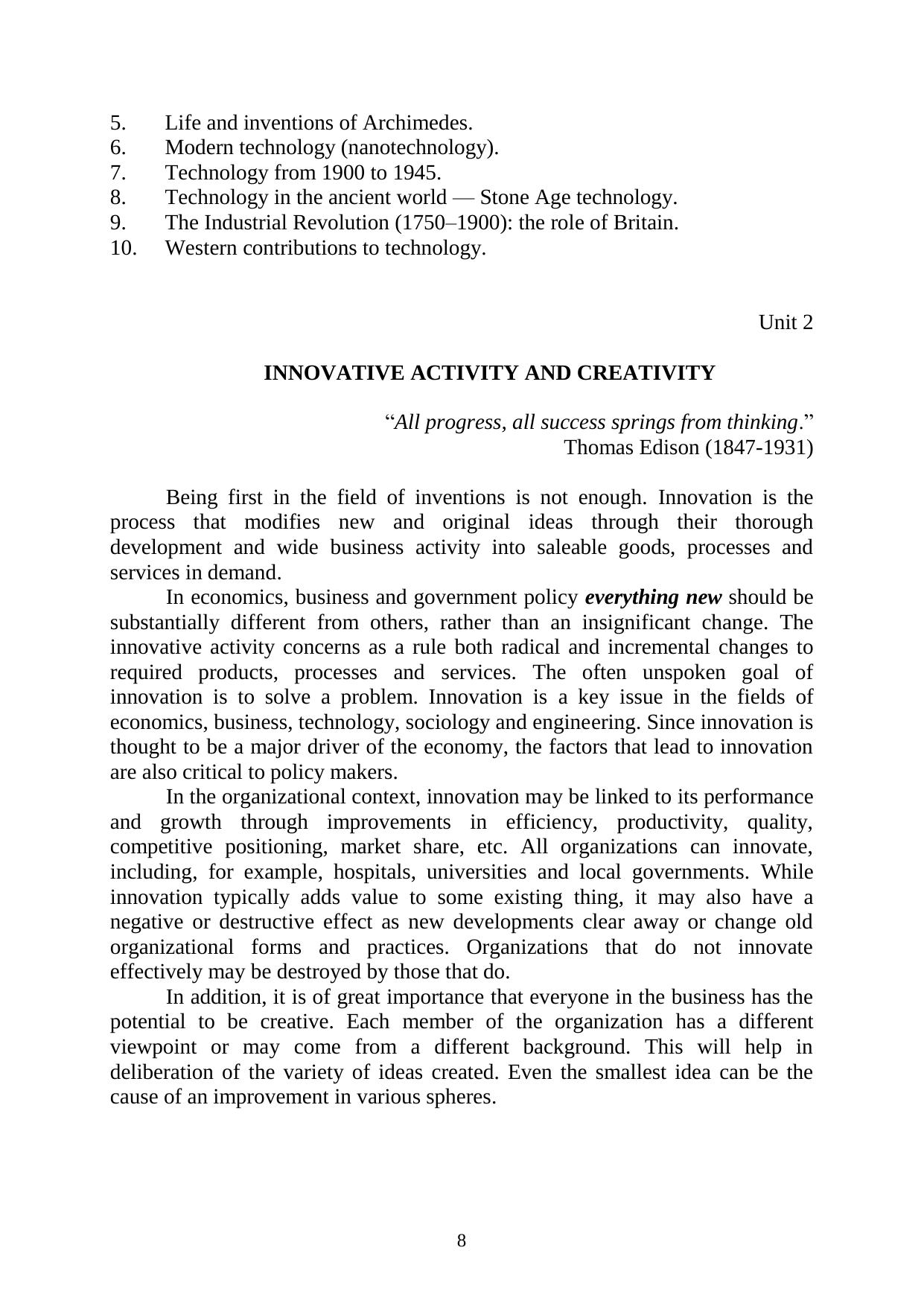 Пособие посвящено рассмотрению проблем инноваций и изобретений последней четверти прошлого века. Каждый из 11 представленных в пособии разделов предполагает самостоятельную работу с оригинальным текстом и снабжен целым рядом заданий, нацеленных на формирование у магистрантов логического мышления, развитие творческого подхода к предлагаемым ситуативным задачам, а также совершенствование навыков говорения и изложения собственного мнения по затронутым проблемам. Предназначено для аудиторной работы студентов первого курса магистратуры (факультет фундаментальной и прикладной химии).