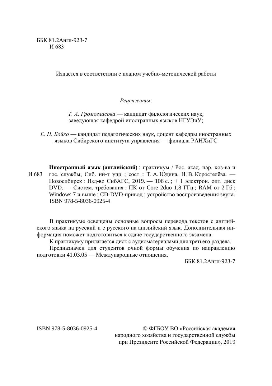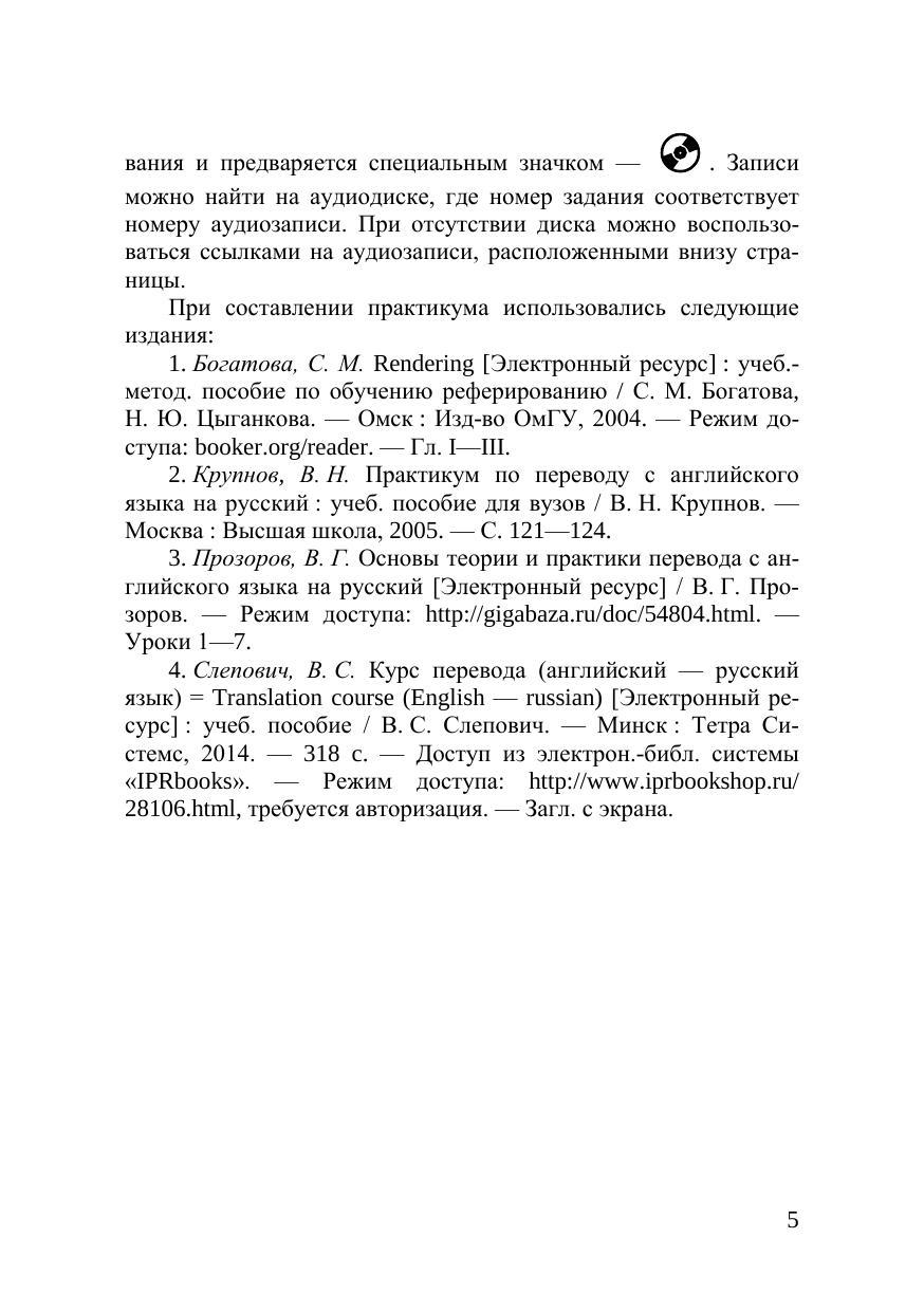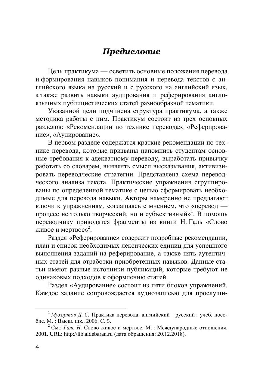В практикуме освещены основные вопросы перевода текстов с англий-ского языка на русский и с русского на английский язык. Дополнительная ин-формация поможет подготовиться к сдаче государственного экзамена. К практикуму прилагается диск с аудиоматериалами для третьего раздела. Предназначен для студентов очной формы обучения по направлению подготовки 41.03.05 — Международные отношения.