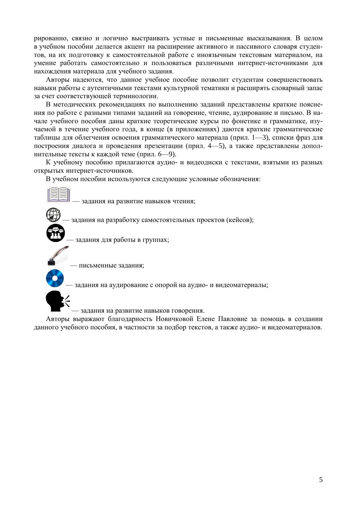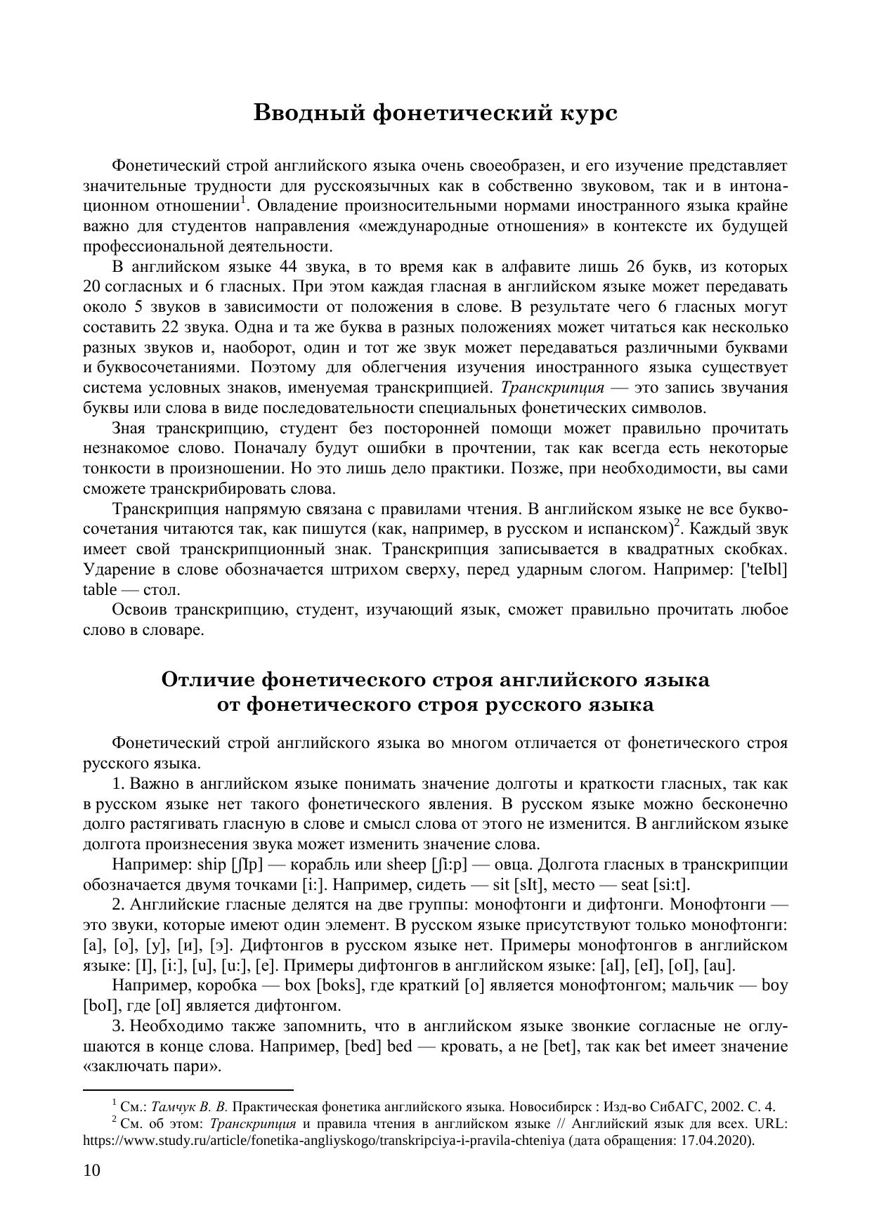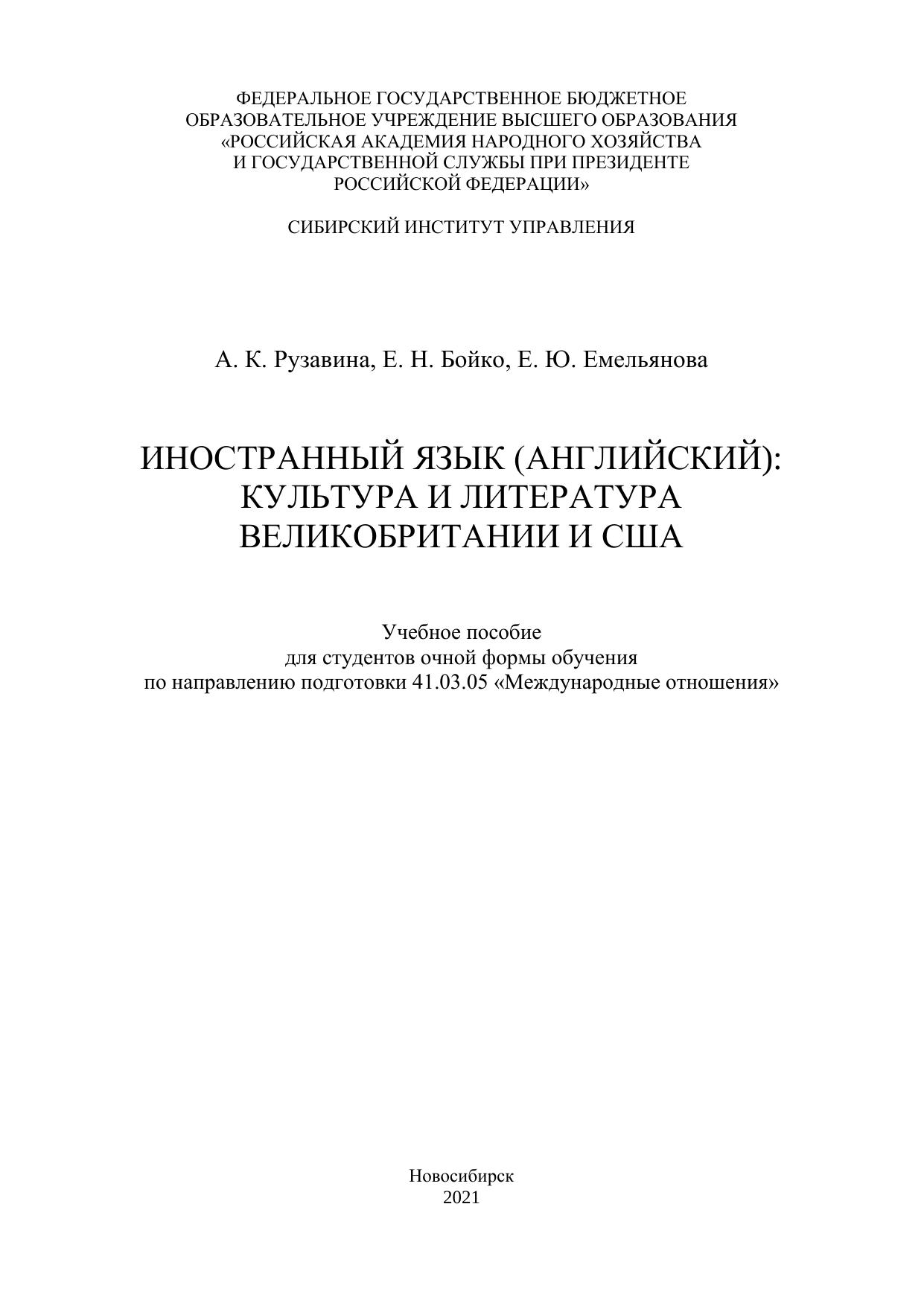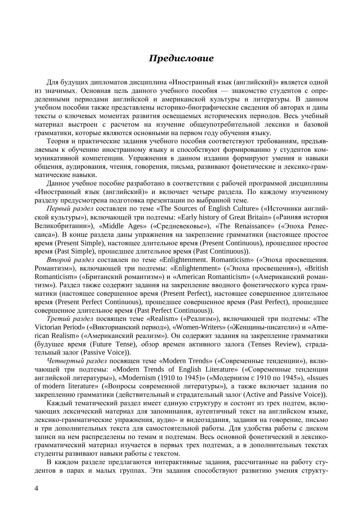 Данное учебное пособие предназначено для изучения дисциплины «Иностранный язык» (английский). Оно состоит из теории (вводного фонетического и грамматического курса) и практики. Практический материал представлен четырьмя разделами, в которых дается описание ключевых моментов развития английской и американской культуры. Тематика разделов определяется рабочей программой дисциплины. При подготовке учебного пособия были использованы аутентичные материалы английских авторов, взятые из открытых источников. Адресовано студентам очной формы обучения по направлению подготовки 41.03.05 «Международные отношения».