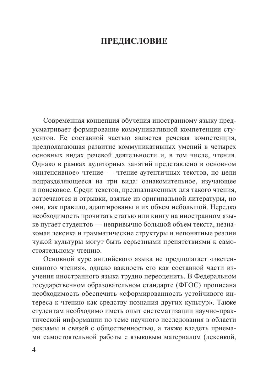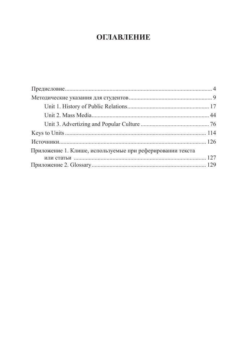 Учебное пособие содержит контрольные задания, которые направлены на совершенствование коммуникативной компетенции студентов, изучающих иностранный язык, в частности английский. Упражнения позволят студентам развить коммуникативные умения в четырех основных видах речевой деятельности — чтении, говорении, аудировании, письме, а также расширить словарный запас и знания грамматических конструкций, связанных со сферой рекламы и связей с общественностью, углубить навыки лингвистического и стилистического анализа профессиональных текстов.