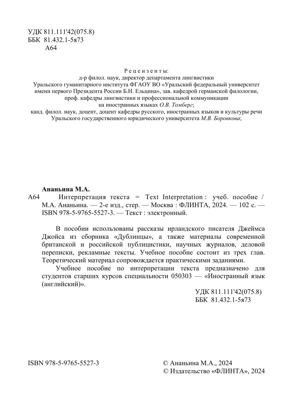 В пособии использованы рассказы ирландского писателя Джеймса Джойса из сборника «Дублинцы», а также материалы современной британской и российской публицистики, научных журналов, деловой переписки, рекламные тексты. Учебное пособие состоит из трех глав. Теоретический материал сопровождается практическими заданиями. Учебное пособие по интерпретации текста предназначено для студентов старших курсов специальности 050303 — «Иностранный язык (английский)».