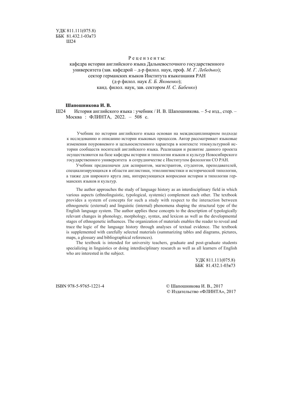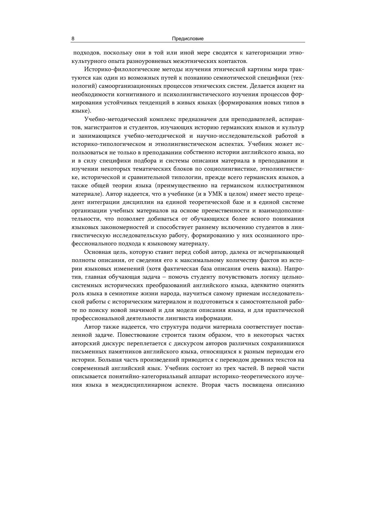 Учебник предназначен для аспирантов, магистрантов, студентов, преподавателей, специализирующихся в области англистики, этнолингвистики и исторической типологии, а также для широкого круга лиц, интересующихся вопросами истории и типологии германских языков и культур.