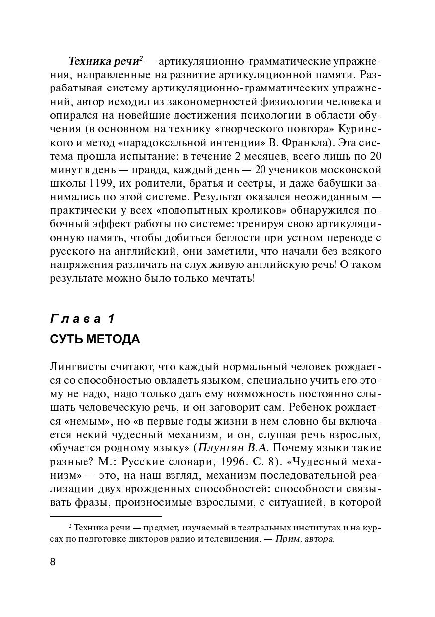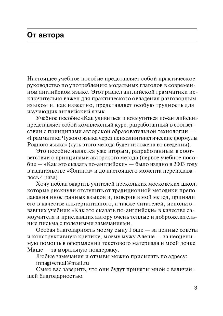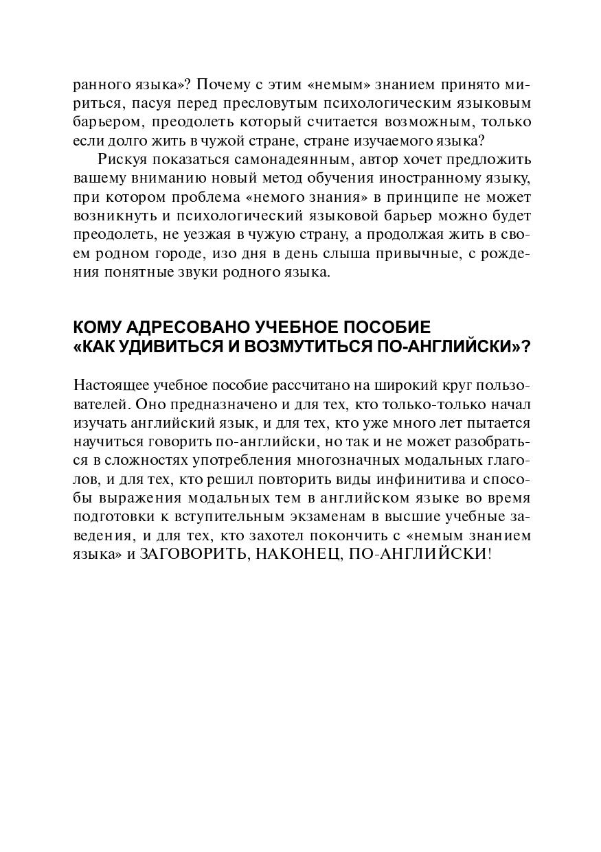 Пособие посвящено проблеме употребления модальных глаголов в современном английском языке и разработано в соответствии с принципами авторской образовательной технологии. Автор предлагает изменить направление, в котором традиционно происходит процесс обучения иностранному языку, на противоположное и расширять свои знания, отталкиваясь не от незнакомого ЧУЖОГО (английского), а от привычного РОДНОГО (русского). Эффективная система упражнений закрепляет навыки разговорной речи и помогает преодолеть психологический языковой барьер.
