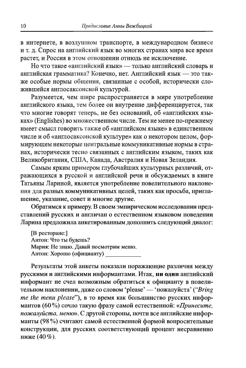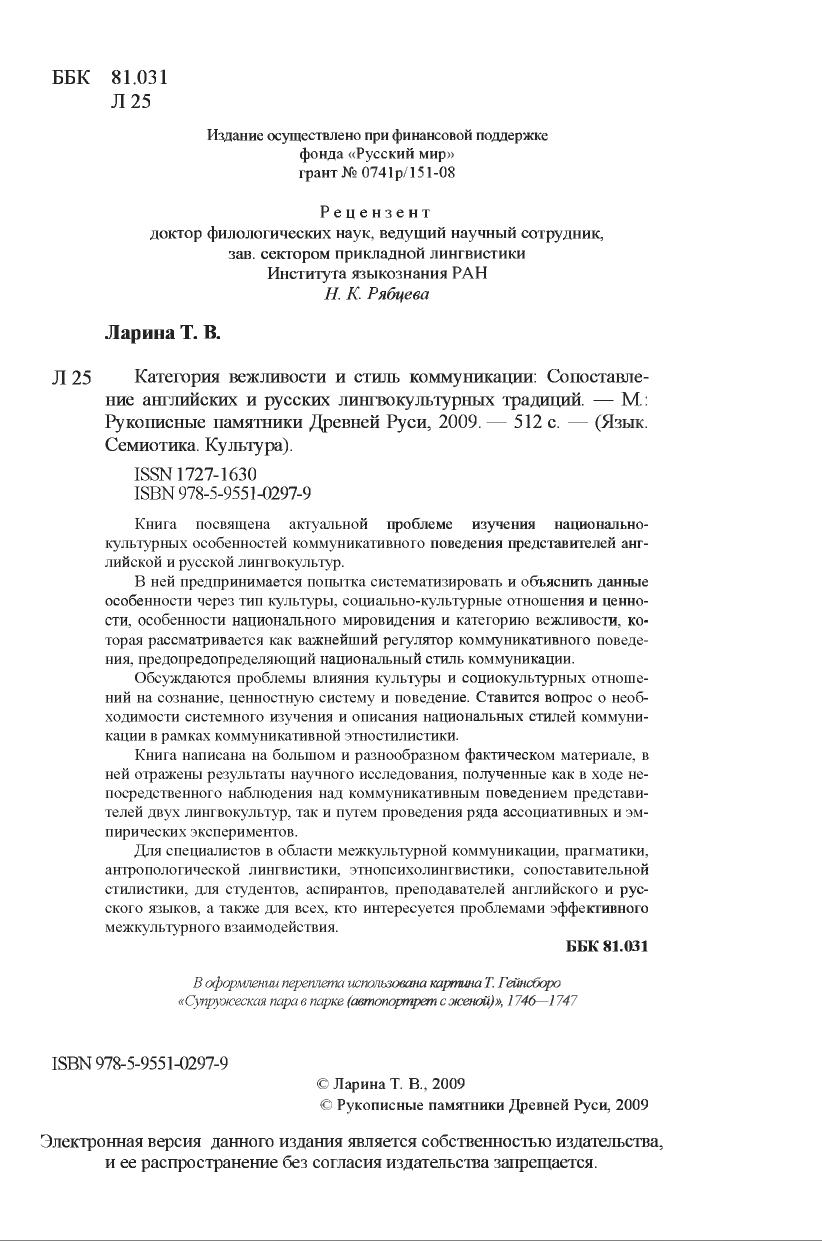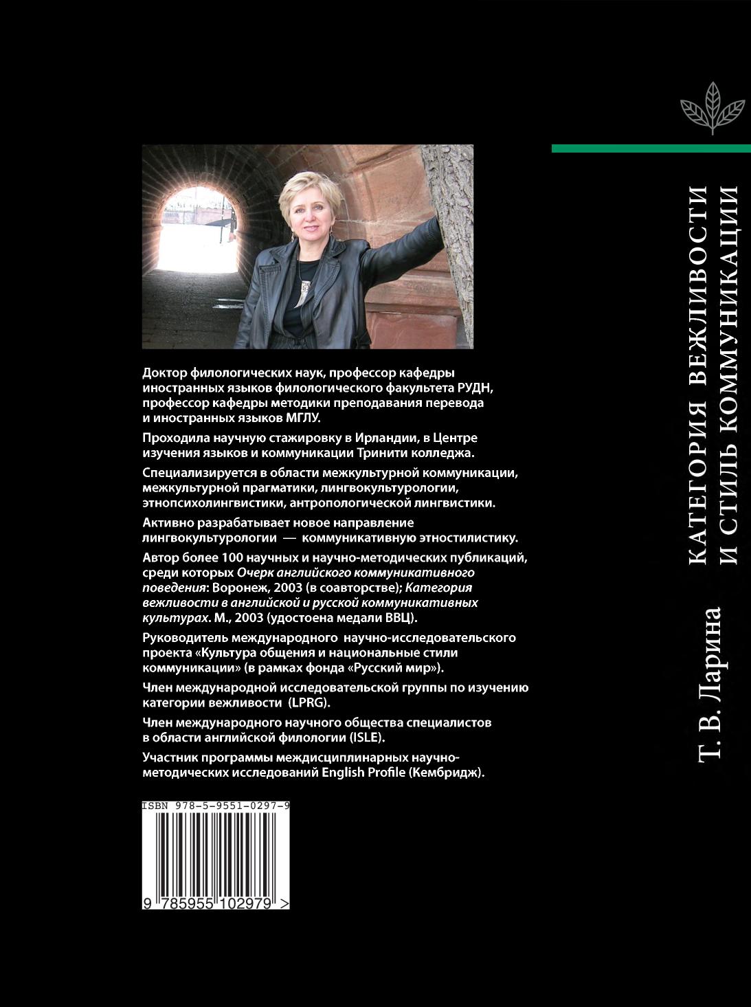 Книга посвящена актуальной проблеме изучения национально-культурных особенностей коммуникативного поведения представителей английской и русской лингвокультур. В ней предпринимается попытка систематизировать и объяснить данные особенности через тип культуры, социально-культурные отношения и ценности, особенности национального мировидения и категорию вежливости, которая рассматривается как важнейший регулятор коммуникативного поведения, предопределяющий национальный стиль коммуникации. Обсуждаются проблемы влияния культуры и социокультурных отношений на сознание, ценностную систему и поведение. Ставится вопрос о необходимости системного изучения и описания национальных стилей коммуникации в рамках коммуникативной этностилистики. Для специалистов в области межкультурной коммуникации, прагматики, антропологической лингвистики, этнопсихолингвистики, сопоставительной стилистики, для студентов, аспирантов, преподавателей английского и русского языков.