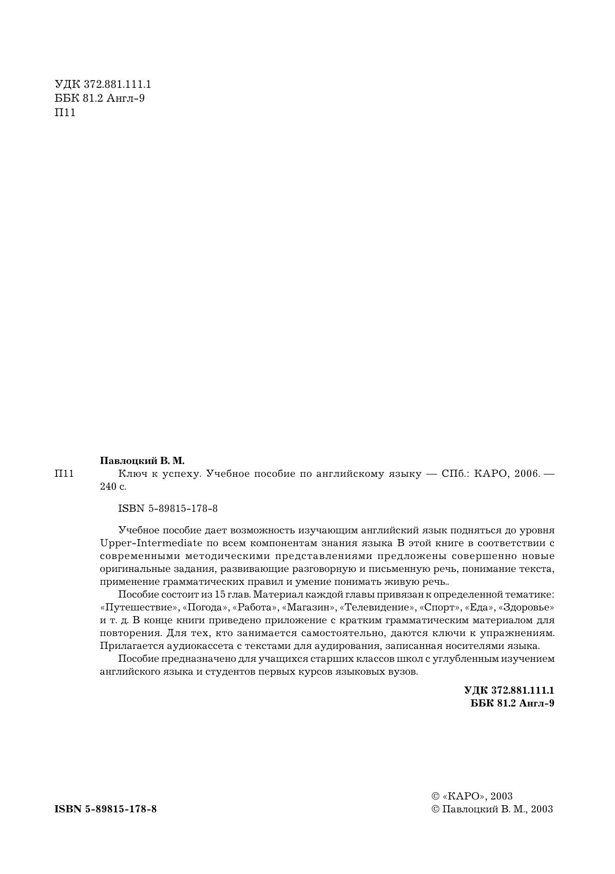 Учебное пособие дает возможность изучающим английский язык подняться до уровня Upper-Intermediate по всем компонентам знания языка В этой книге в соответствии с современными методическими представлениями предложены совершенно новые оригинальные задания, развивающие разговорную и письменную речь, понимание текста, применение грамматических правил и умение понимать живую речь.. Пособие состоит из 15 глав. Материал каждой главы привязан к определенной тематике: «Путешествие», «Погода», «Работа», «Магазин», «Телевидение», «Спорт», «Еда», «Здоровье» и т. д. В конце книги приведено приложение с кратким грамматическим материалом для повторения. Для тех, кто занимается самостоятельно, даются ключи к упражнениям. Прилагается аудиокассета с текстами для аудирования, записанная носителями языка. Пособие предназначено для учащихся старших классов школ с углубленным изучением английского языка и студентов первых курсов языковых вузов.