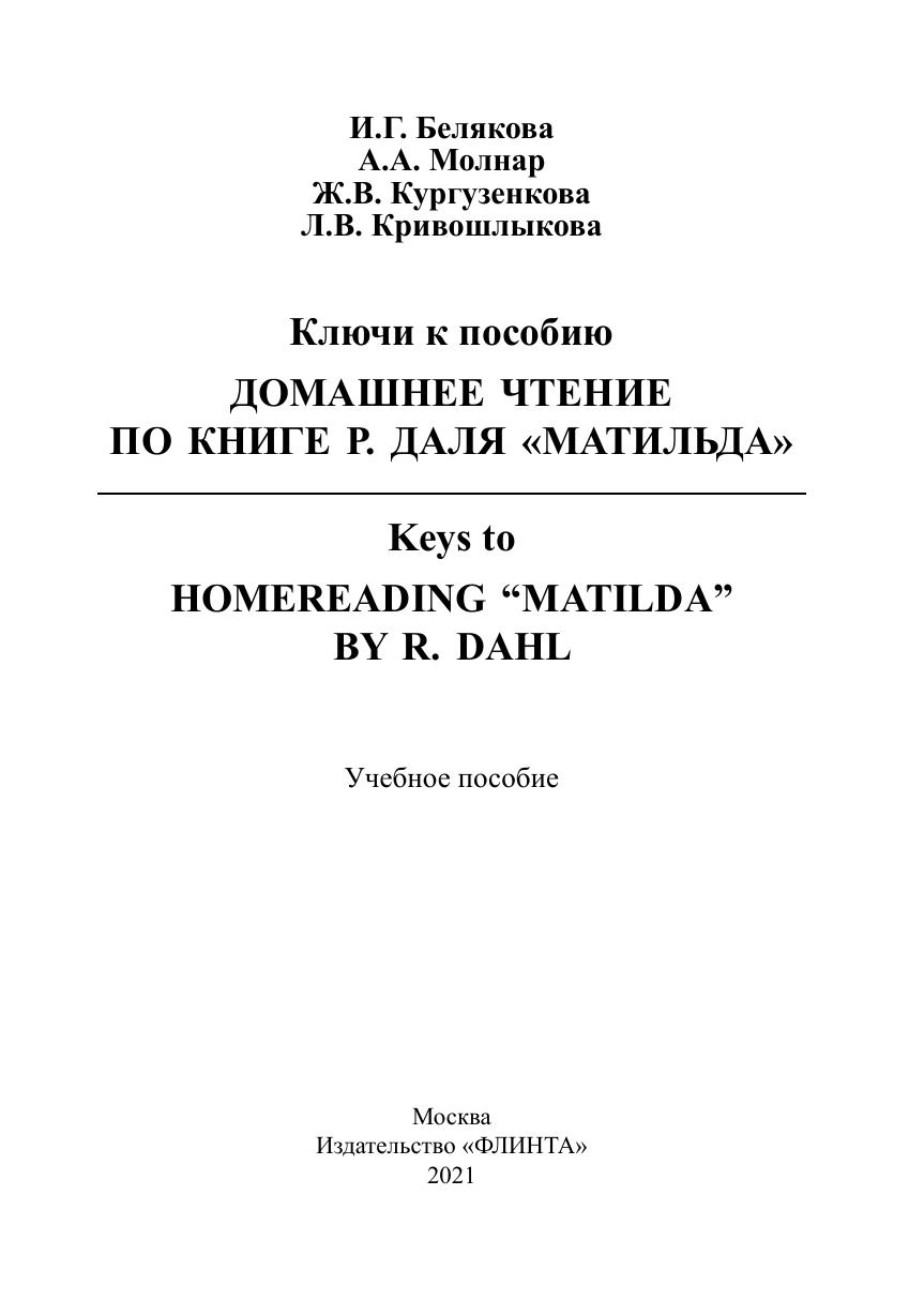 Ключи к пособию «Домашнее чтение по книге Р. Даля "Матильда"» = Keys to "Homereading 'Matilda' by R. Dahl"