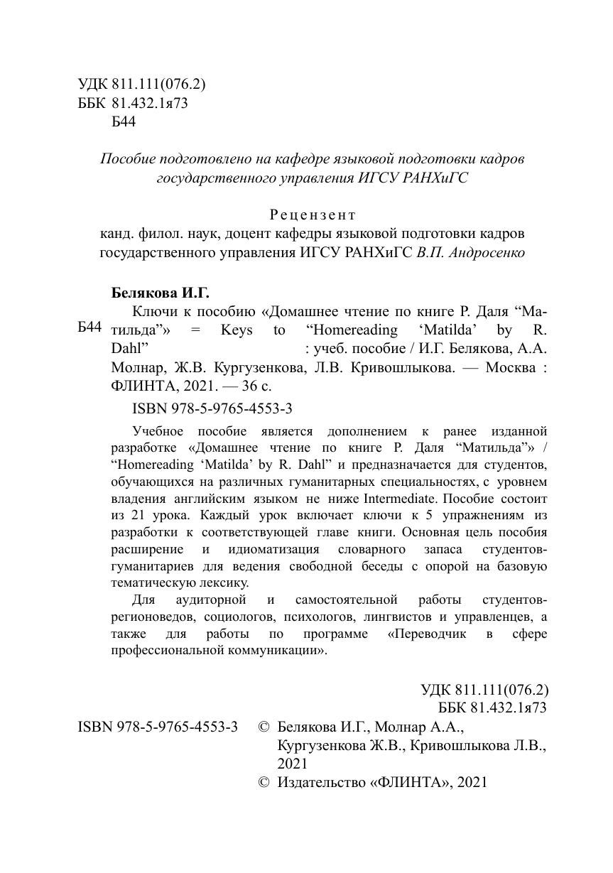 Учебное пособие является дополнением к ранее изданной разработке «Домашнее чтение по книге Р. Даля “Матильда”» / “Homereading ‘Matilda’ by R. Dahl” и предназначается для студентов, обучающихся на различных гуманитарных специальностях, с уровнем владения английским языком не ниже Intermediate. Пособие состоит из 21 урока. Каждый урок включает ключи к 5 упражнениям из разработки к соответствующей главе книги. Основная цель пособия расширение и идиоматизация словарного запаса студентов-гуманитариев для ведения свободной беседы с опорой на базовую тематическую лексику.