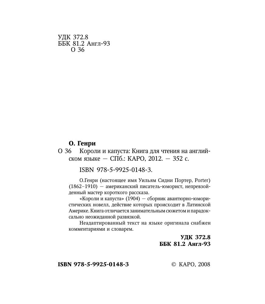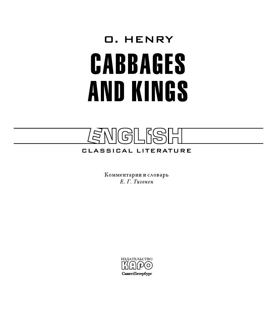 О.Генри (настоящее имя Уильям Сидни Портер, Porter) (1862–1910) — американский писатель-юморист, непревзойденный мастер короткого рассказа.«Короли и капуста» (1904) — сборник авантюрно-юмористических новелл, действие которых происходит в Латинской Америке. Книга отличается занимательным сюжетом и парадоксально неожиданной развязкой.Неадаптированный текст на языке оригинала снабжен комментариями и словарем.