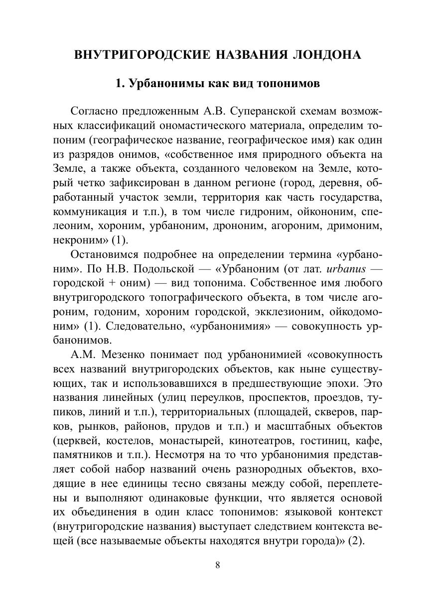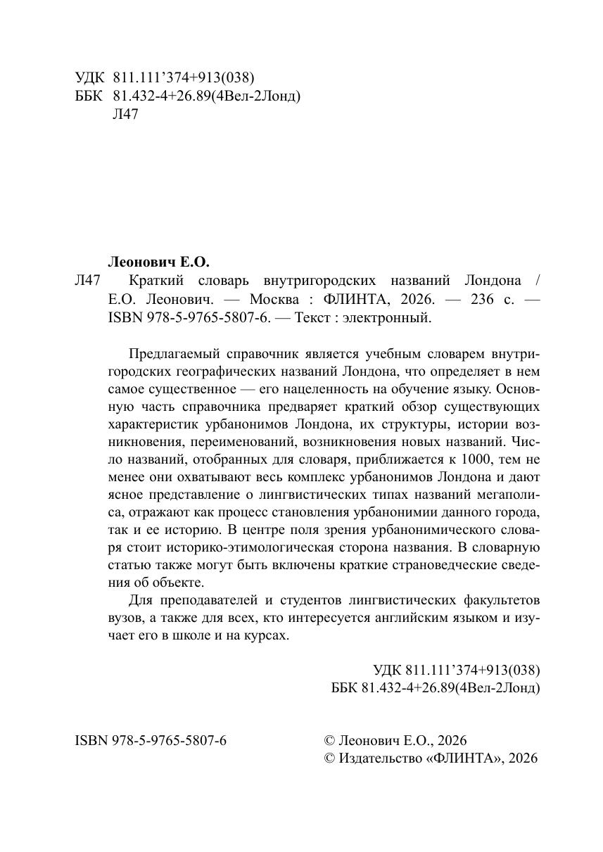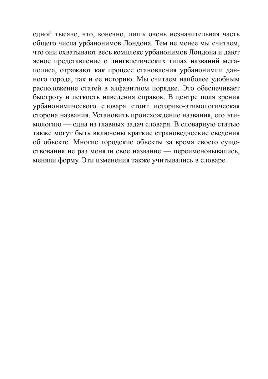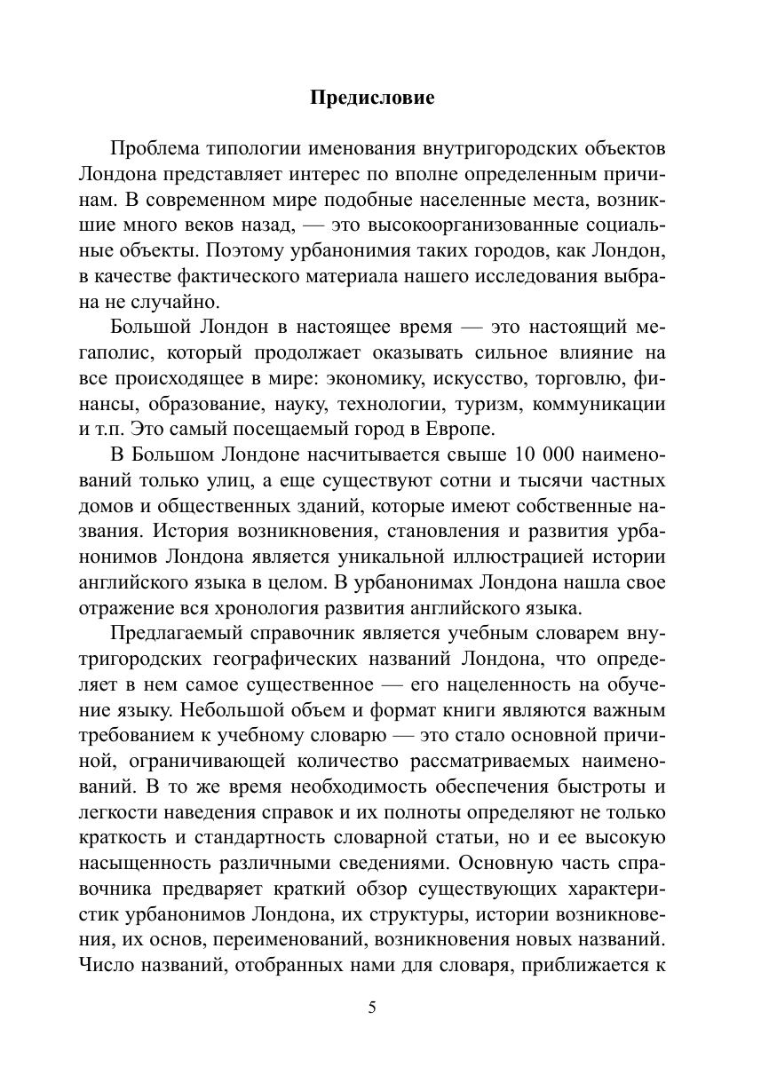 Предлагаемый справочник является учебным словарем внутригородских географических названий Лондона, что определяет в нем самое существенное — его нацеленность на обучение языку. Основную часть справочника предваряет краткий обзор существующих характеристик урбанонимов Лондона, их структуры, истории возникновения, переименований, возникновения новых названий. Число названий, отобранных для словаря, приближается к 1000, тем не менее они охватывают весь комплекс урбанонимов Лондона и дают ясное представление о лингвистических типах названий мегаполиса, отражают как процесс становления урбанонимии данного города, так и ее историю. В центре поля зрения урбанонимического словаря стоит историко-этимологическая сторона названия. В словарную статью также могут быть включены краткие страноведческие сведения об объекте. Для преподавателей и студентов лингвистических факультетов вузов, а также для всех, кто интересуется английским языком и изучает его в школе и на курсах.