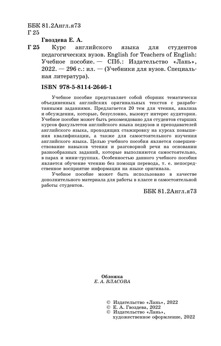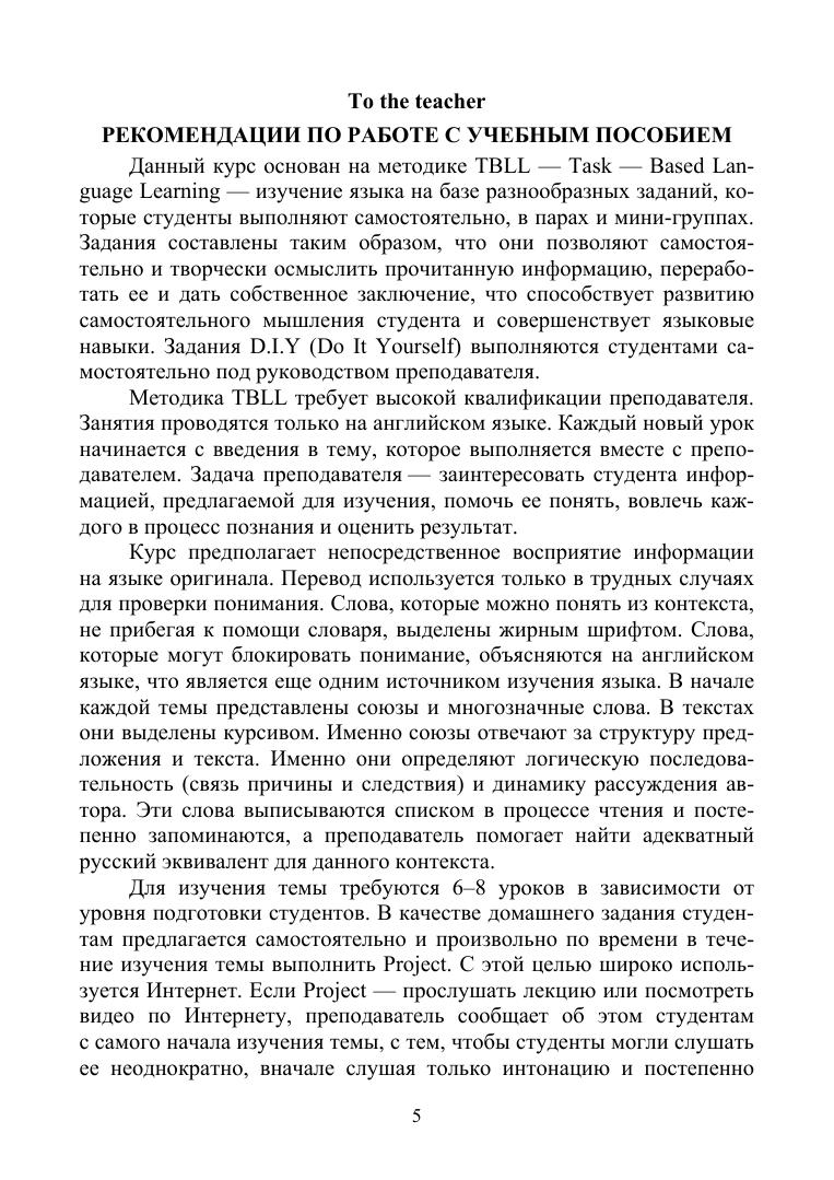 Учебное пособие представляет собой сборник тематически объединённых английских оригинальных текстов с разработанными заданиями. Предлагается 20 тем для чтения, анализа и обсуждения, которые, безусловно, вызовут интерес аудитории. Учебное пособие может быть рекомендовано для студентов старших курсов факультетов английского языка педвузов и преподавателей английского языка, проходящих стажировку на курсах повышения квалификации, а также для самостоятельного изучения английского языка. Целью учебного пособия является совершенствование навыков чтения и разговорной речи на основании разнообразных заданий, которые выполняются самостоятельно, в парах и мини-группах. Особенностью данного учебного пособия является обучение чтению без помощи перевода, т. е. непосредственное восприятие информации на языке оригинала. Учебное пособие предназначено для студентов, обучающихся по направлению подготовки «Педагогическое образование».