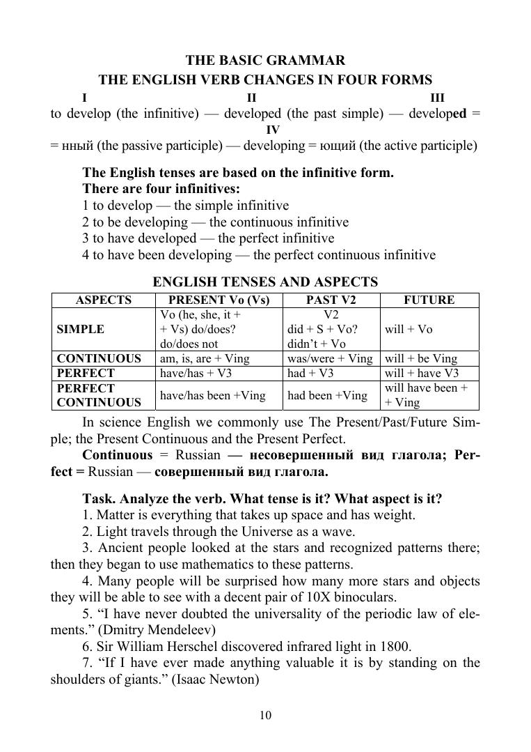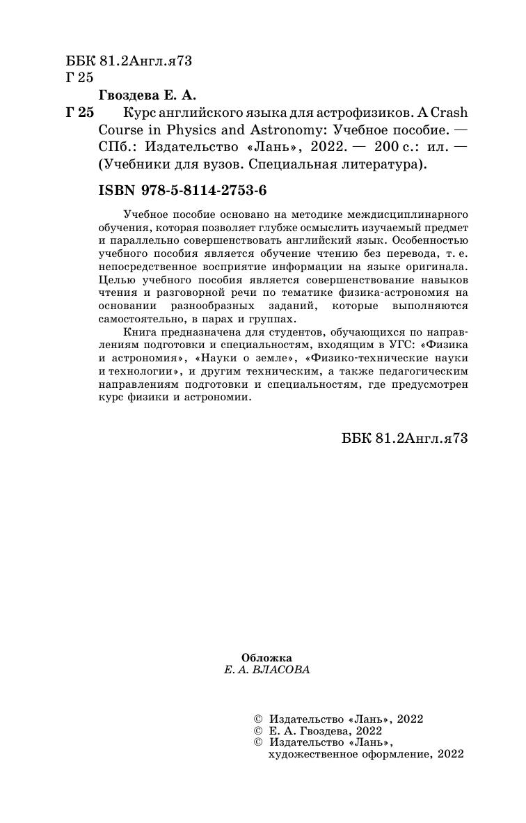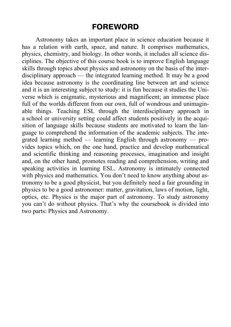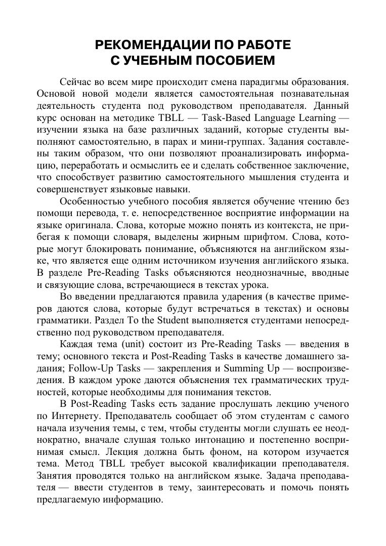 Учебное пособие основано на методике междисциплинарного обучения, которая позволяет глубже осмыслить изучаемый предмет и параллельно совершенствовать английский язык. Особенностью учебного пособия является обучение чтению без перевода, т. е. непосредственное восприятие информации на языке оригинала. Целью учебного пособия является совершенствование навыков чтения и разговорной речи по тематике физика-астрономия на основании разнообразных заданий, которые выполняются самостоятельно, в парах и группах. Книга предназначена для студентов, обучающихся по направлениям подготовки и специальностям, входящим в УГС: «Физика и астрономия», «Науки о земле», «Физико-технические науки и технологии», и другим техническим, а также педагогическим направлениям подготовки и специальностям, где предусмотрен курс физики и астрономии.