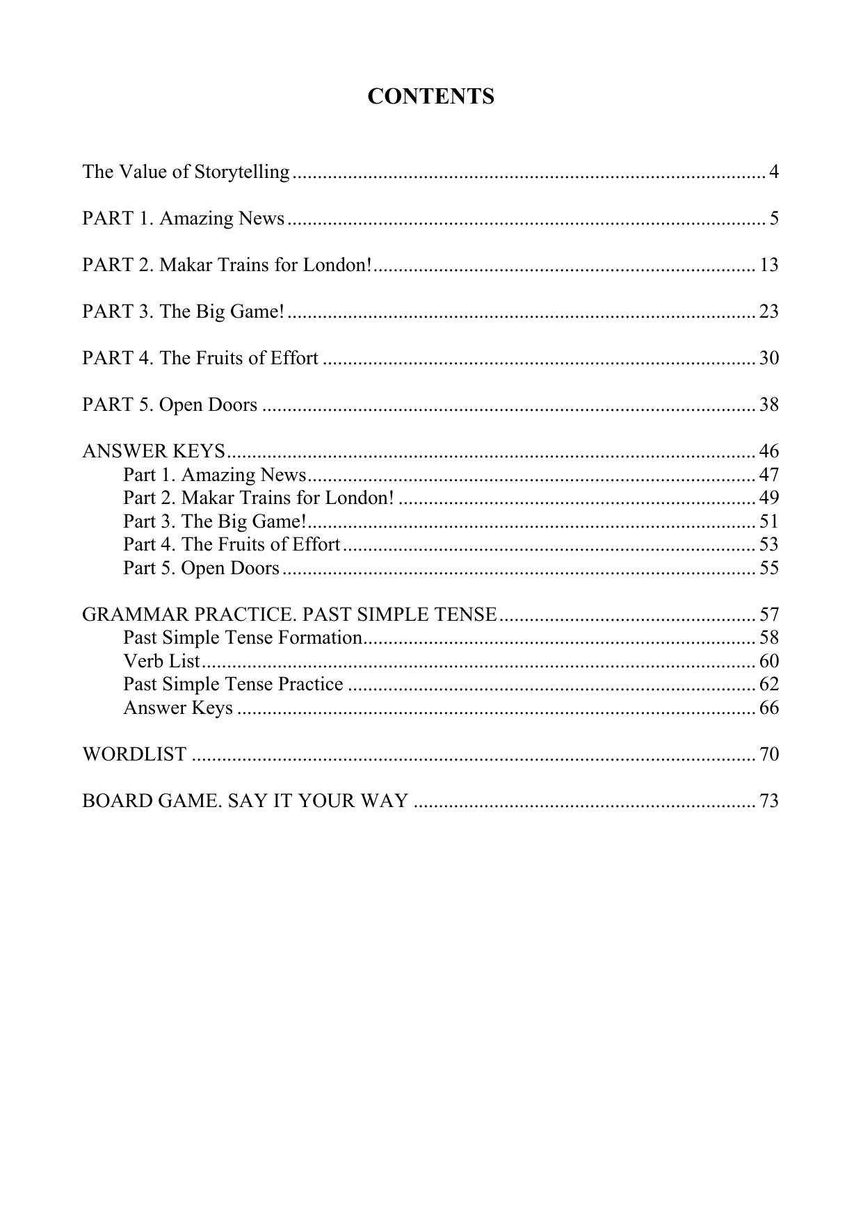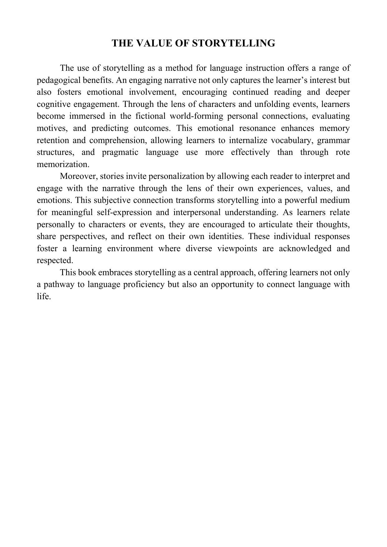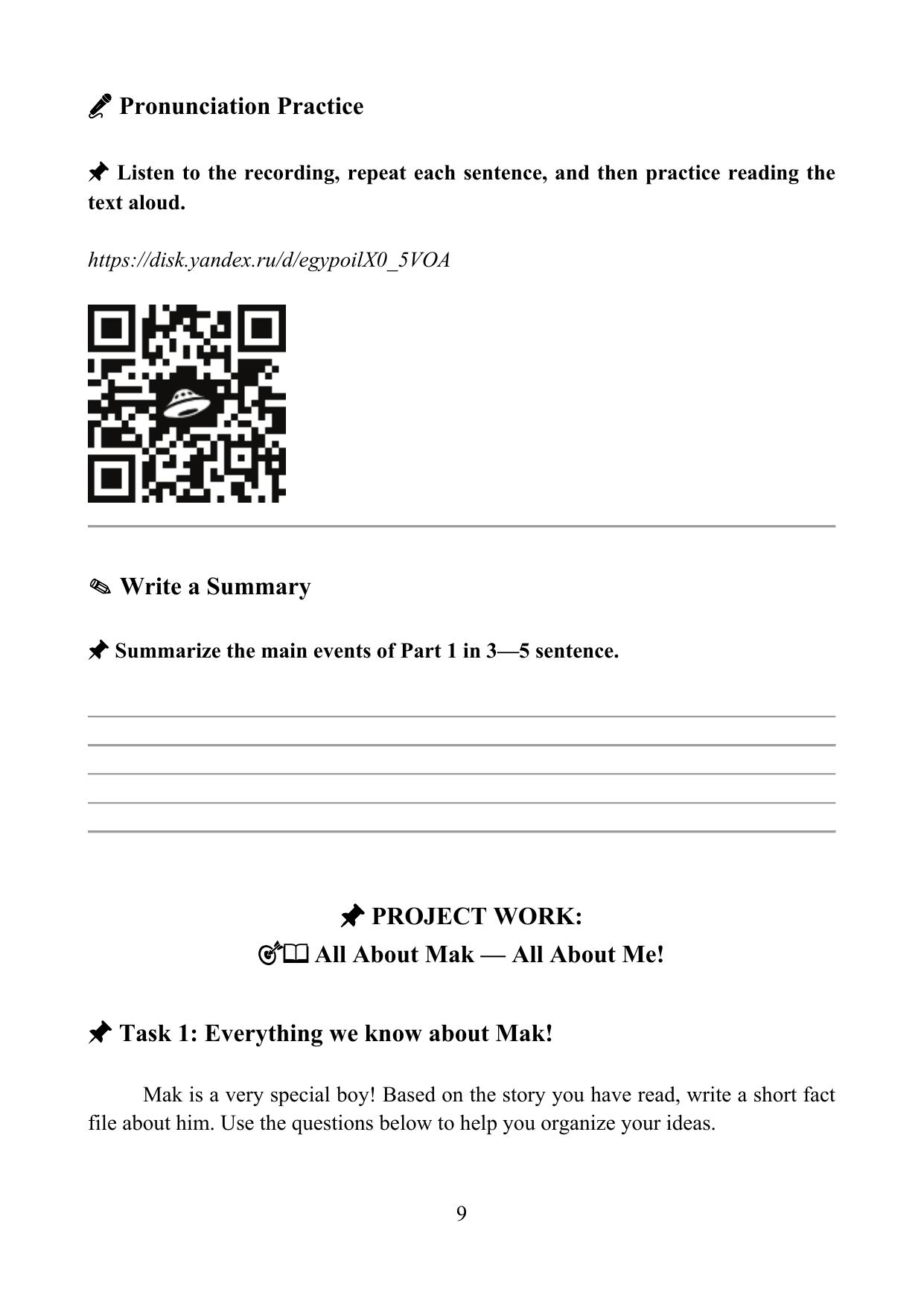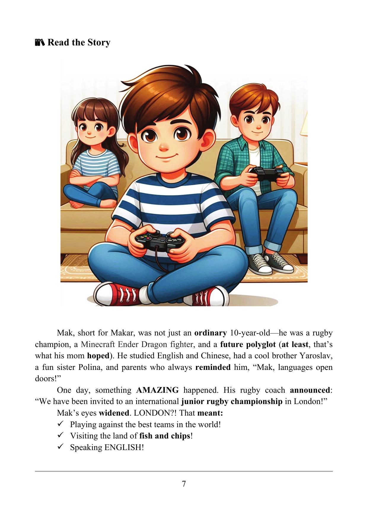 Пособие разработано на основе сюжетно-повествовательного подхода (Storytelling), который наряду с иноязычной коммуникативной компетенцией развивает широкий спектр метапредметных компетенций, таких как креативное мышление, эмпатию и культурную восприимчивость учащихся, способствует формированию устойчивого познавательного интереса к изучению английского языка. Пособие состоит из пяти глав, объединенных общим сюжетом. Каждая глава содержит текст для чтения, задания на понимание прочитанного, упражнения на развитие произносительных навыков, а также интерактивный лексический блок. Завершающим этапом каждой главы является проектная работа, интегрирующая изученный материал с личным опытом учащихся. Грамматический компонент курса направлен на совершенствование навыков использования прошедшего времени (Past Simple Tense). Пособие включает настольную игру “Say It Your Way” («Скажи по-своему»), позволяющую в