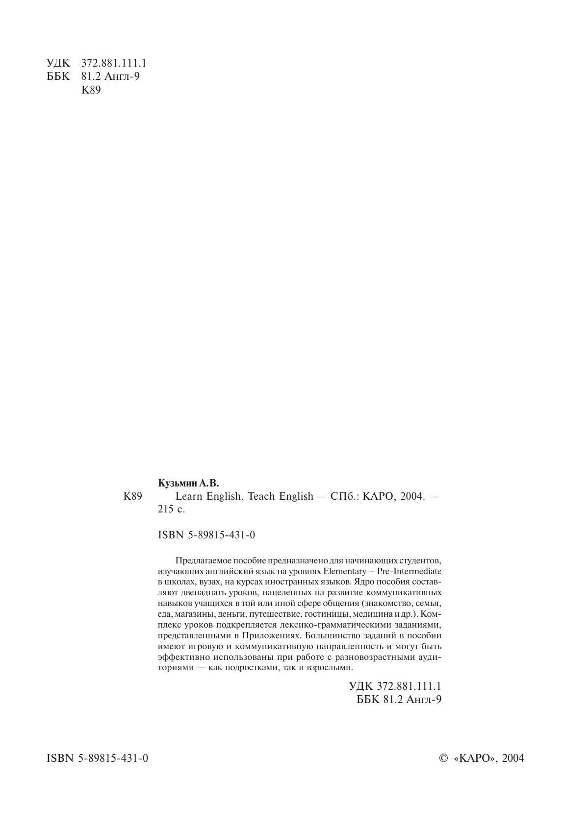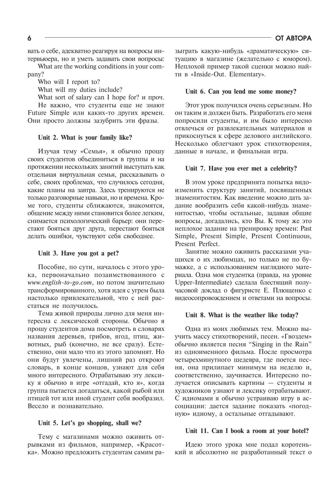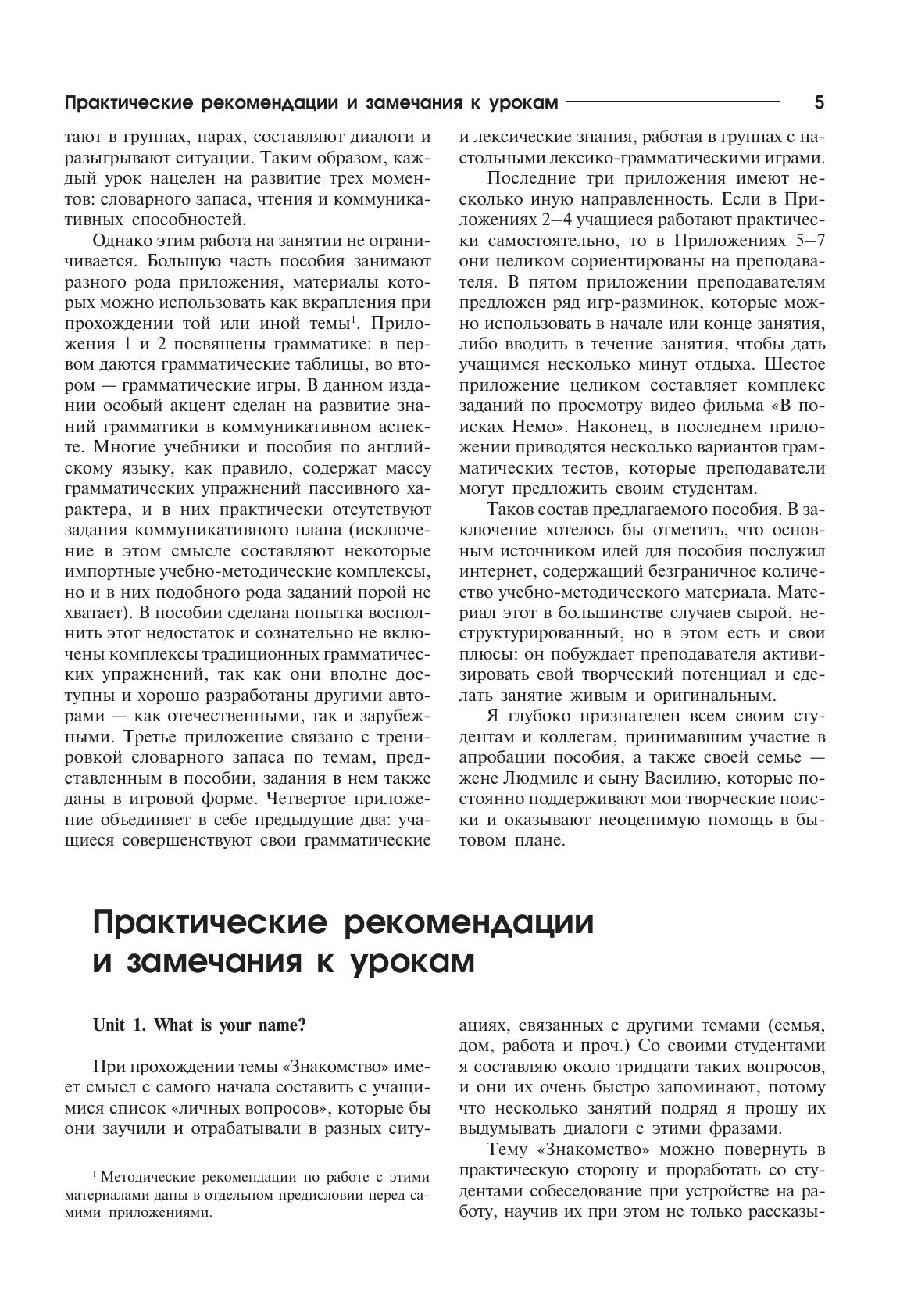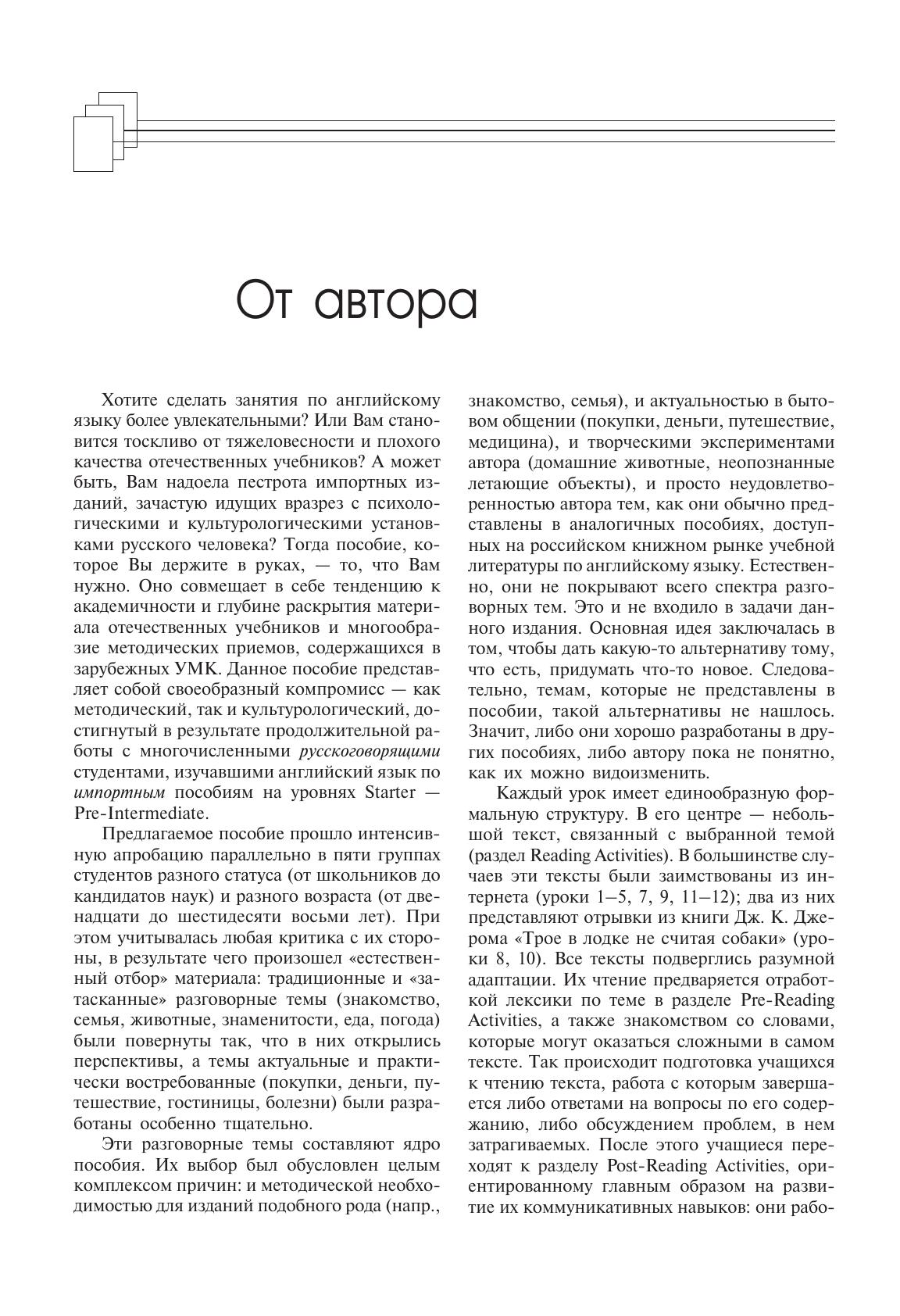 Предлагаемое пособие предназначено для начинающих студентов, изучающих английский язык на уровнях Elementary – Pre-Intermediate в школах, вузах, на курсах иностранных языков. Ядро пособия составляют двенадцать уроков, нацеленных на развитие коммуникативных навыков учащихся в той или иной сфере общения (знакомство, семья, еда, магазины, деньги, путешествие, гостиницы, медицина и др.). Комплекс уроков подкрепляется лексико-грамматическими заданиями, представленными в Приложениях. Большинство заданий в пособии имеют игровую и коммуникативную направленность и могут быть эффективно использованы при работе с разновозрастными аудиториями — как подростками, так и взрослыми.