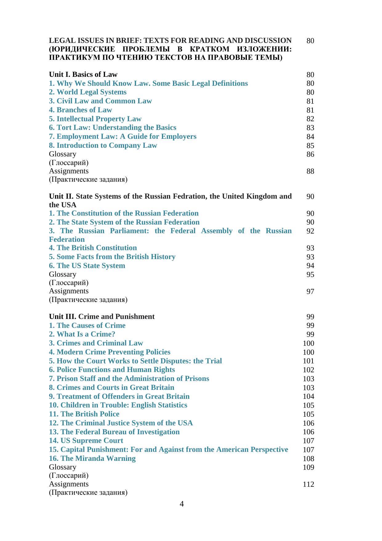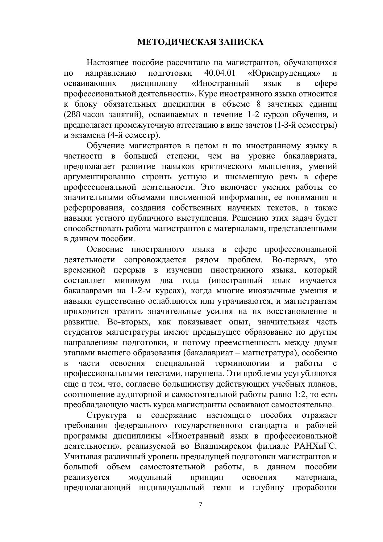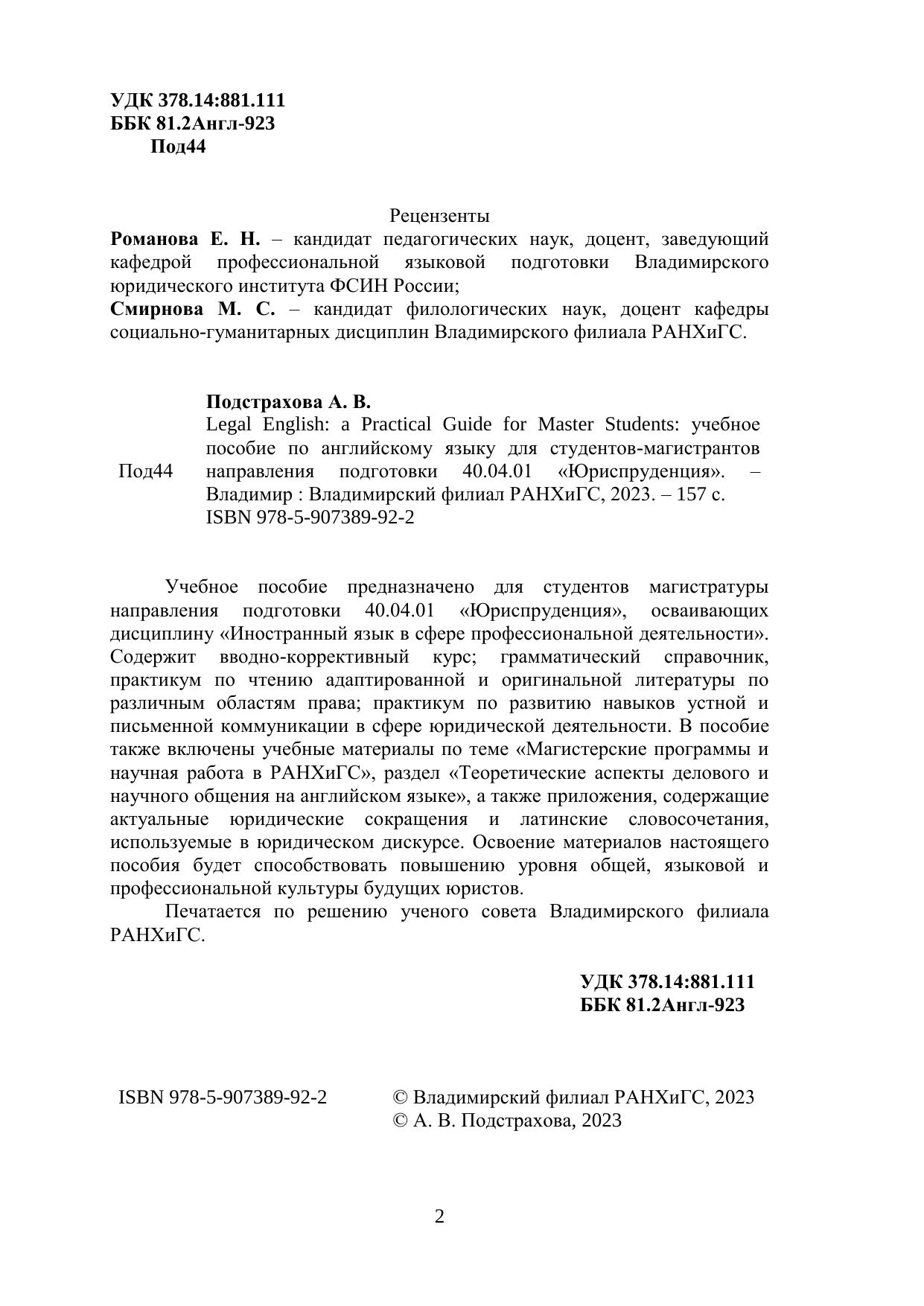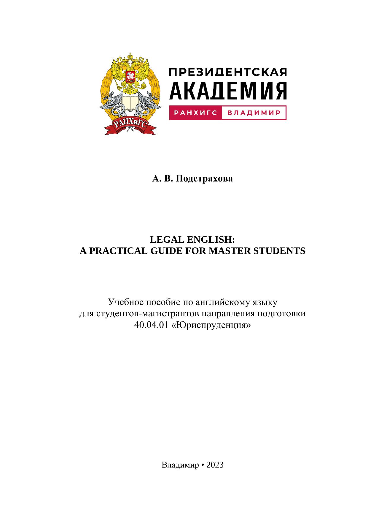 Учебное пособие предназначено для студентов магистратуры направления подготовки 40.04.01 «Юриспруденция», осваивающих дисциплину «Иностранный язык в сфере профессиональной деятельности». Содержит вводно-коррективный курс; грамматический справочник, практикум по чтению адаптированной и оригинальной литературы по различным областям права; практикум по развитию навыков устной и письменной коммуникации в сфере юридической деятельности. В пособие также включены учебные материалы по теме «Магистерские программы и научная работа в РАНХиГС», раздел «Теоретические аспекты делового и научного общения на английском языке», а также приложения, содержащие актуальные юридические сокращения и латинские словосочетания, используемые в юридическом дискурсе. Освоение материалов настоящего пособия будет способствовать повышению уровня общей, языковой и профессиональной культуры будущих юристов. Печатается по решению ученого совета Владимирского филиала РАНХиГС.