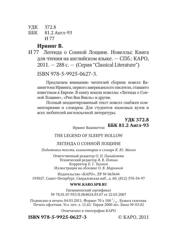 Легенда о Сонной лощине (кн. д/чт. на англ. яз, неадаптир.)