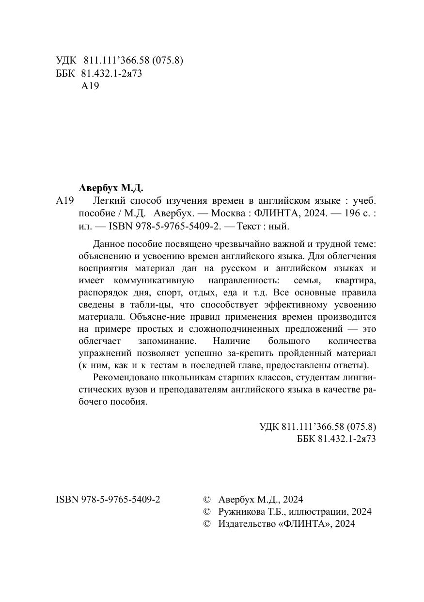 Данное пособие посвящено чрезвычайно важной и трудной теме: объяснению и усвоению времен английского языка. Для облегчения восприятия материал дан на русском и английском языках и имеет коммуникативную направленность: семья, квартира, распорядок дня, спорт, отдых, еда и т.д. Все основные правила сведены в таблицы, что способствует эффективному усвоению материала. Объяснение правил применения времен производится на примере простых и сложноподчиненных предложений — это облегчает запоминание. Наличие большого количества упражнений позволяет успешно закрепить пройденный материал (к ним, как и к тестам в последней главе, предоставлены ответы).