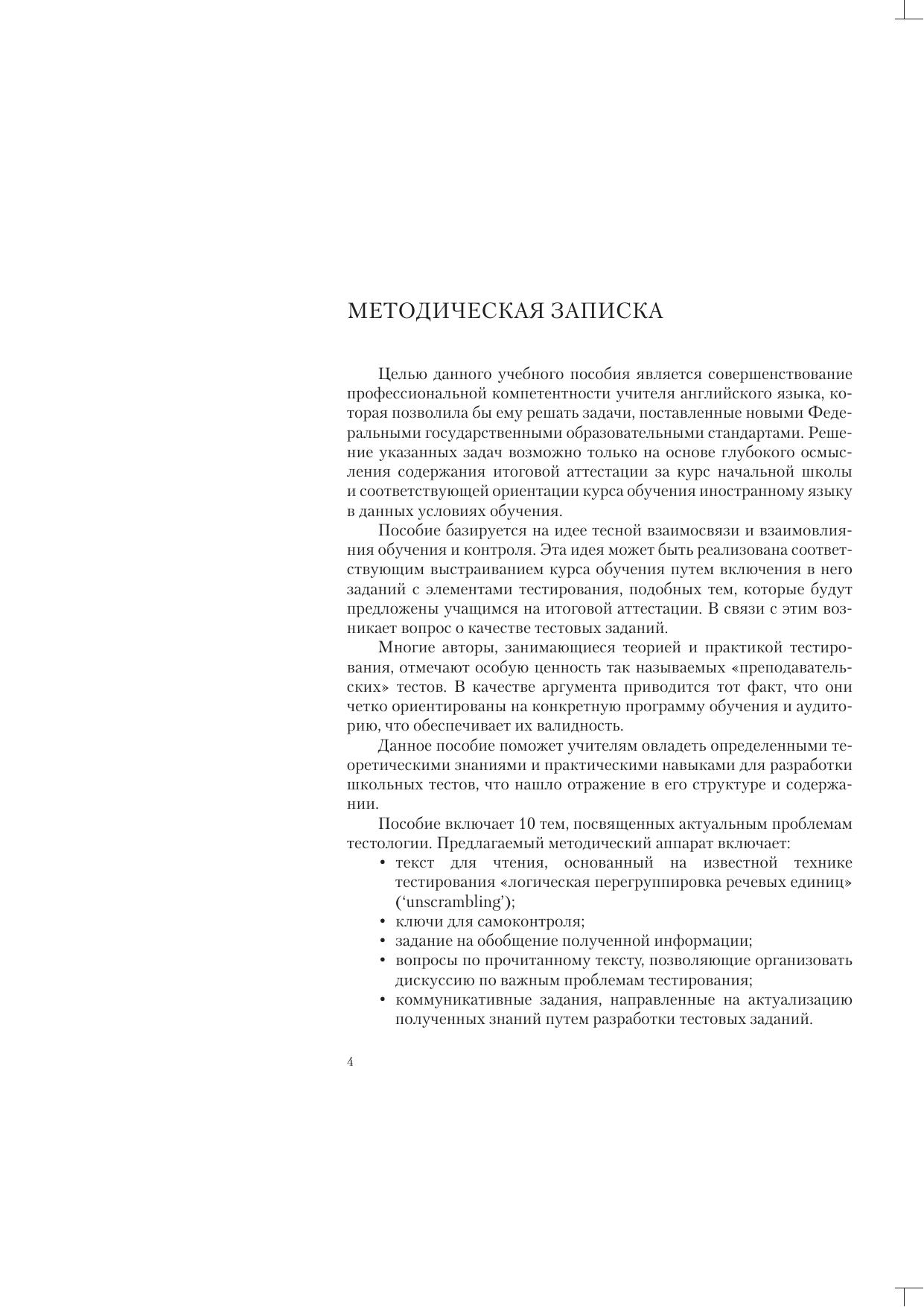 Пособие включает 10 тем, охватывающих актуальные проблемы теории и практики лингводидактического тестирования, ознакомление с которыми позволяют учителям самостоятельно разрабатывать преподавательские тесты для конкретных условий обучения при использовании различных УМК и тем самым целенаправленно готовить учащихся к итоговой аттестации за курс начальной школы.