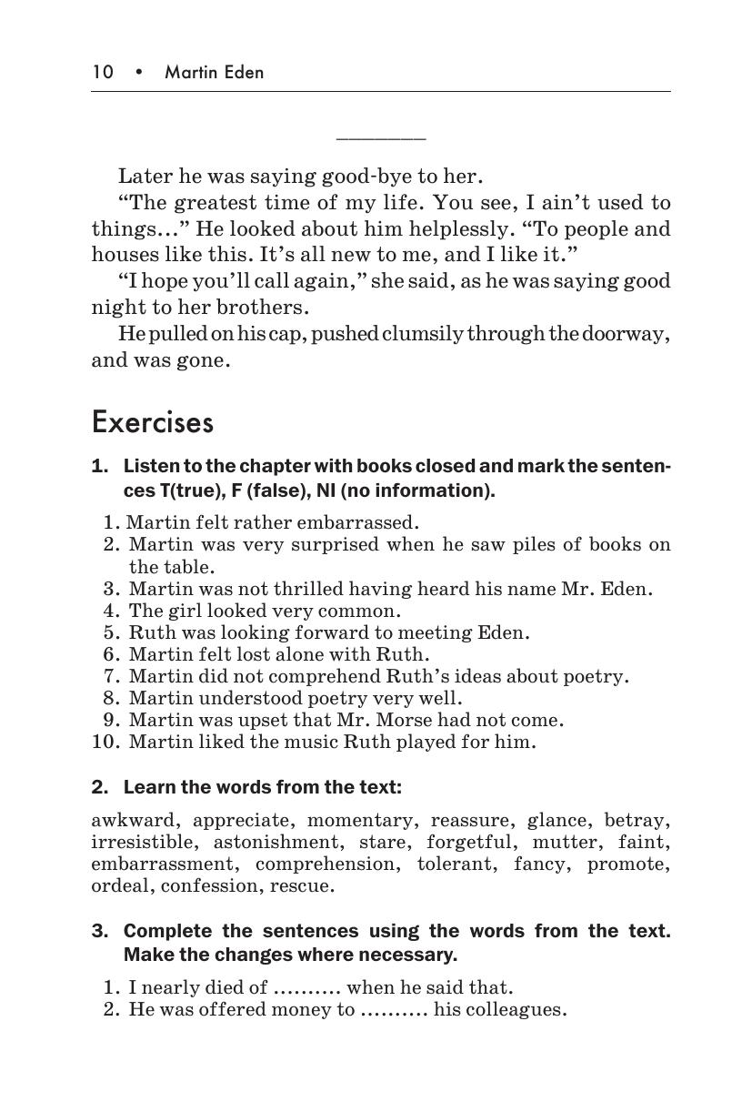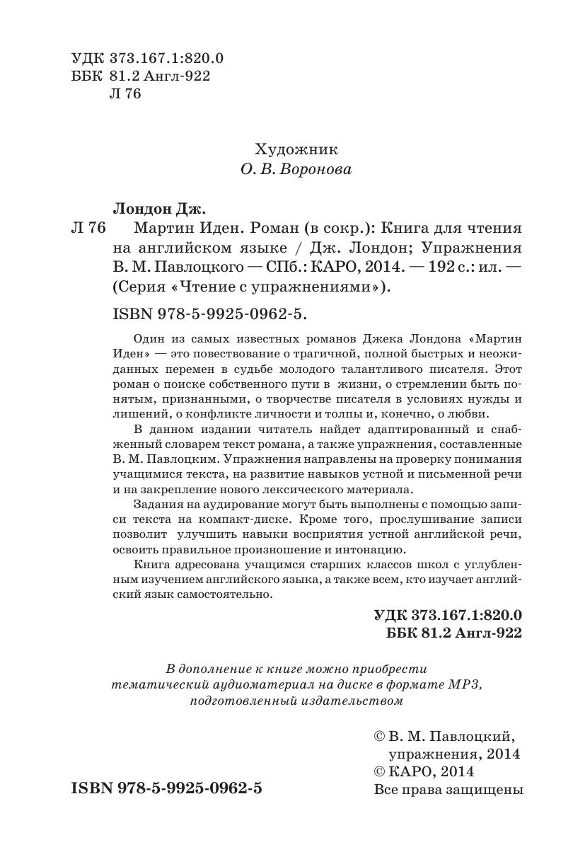 В данном издании читатель найдет адаптированный и снабженный словарем текст романа, а также упражнения, составленные В. М. Павлоцким. Упражнения направлены на проверку понимания учащимися текста, на развитие навыков устной и письменной речи и на закреп ление нового лексического материала.