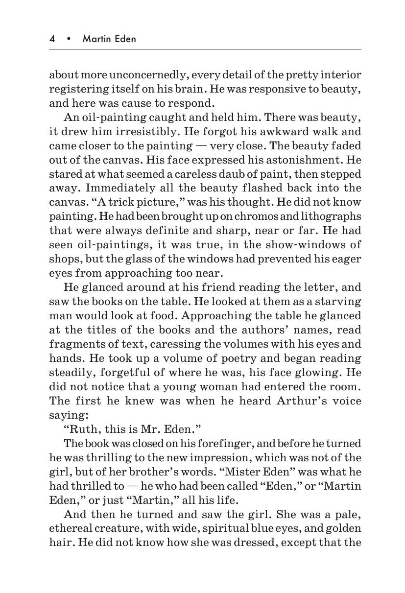 Один из самых известных романов Джека Лондона «Мартин Иден» — это повествование о трагичной, полной быстрых и неожиданных перемен в судьбе молодого талантливого писателя. Этот роман о поиске собственного пути в жизни, о стремлении быть понятым, признанными, о творчестве писателя в условиях нужды и лишений, о конфликте личности и толпы и, конечно, о любви.