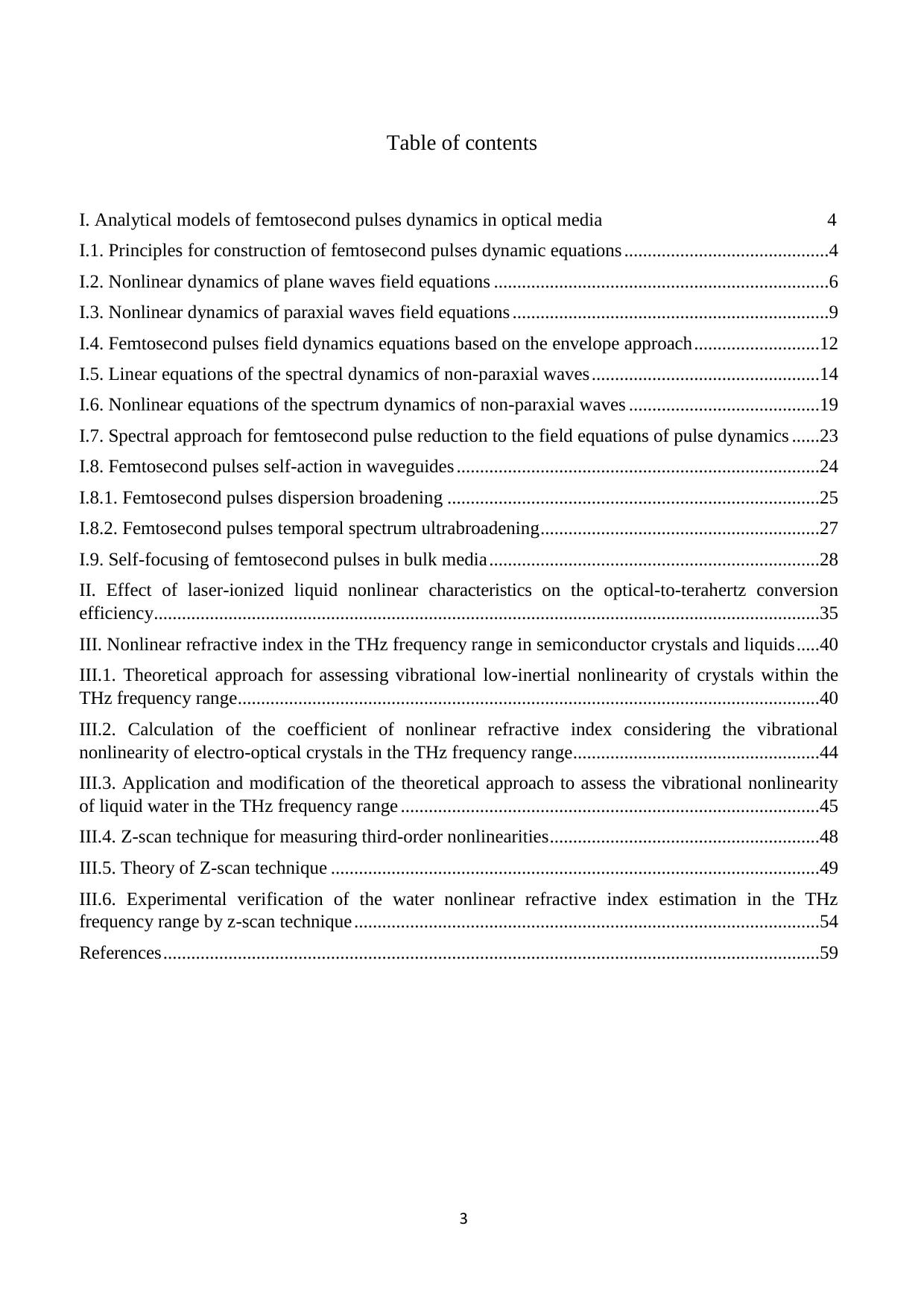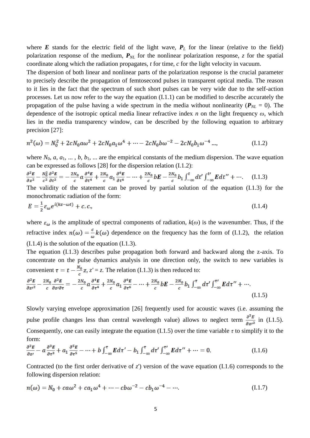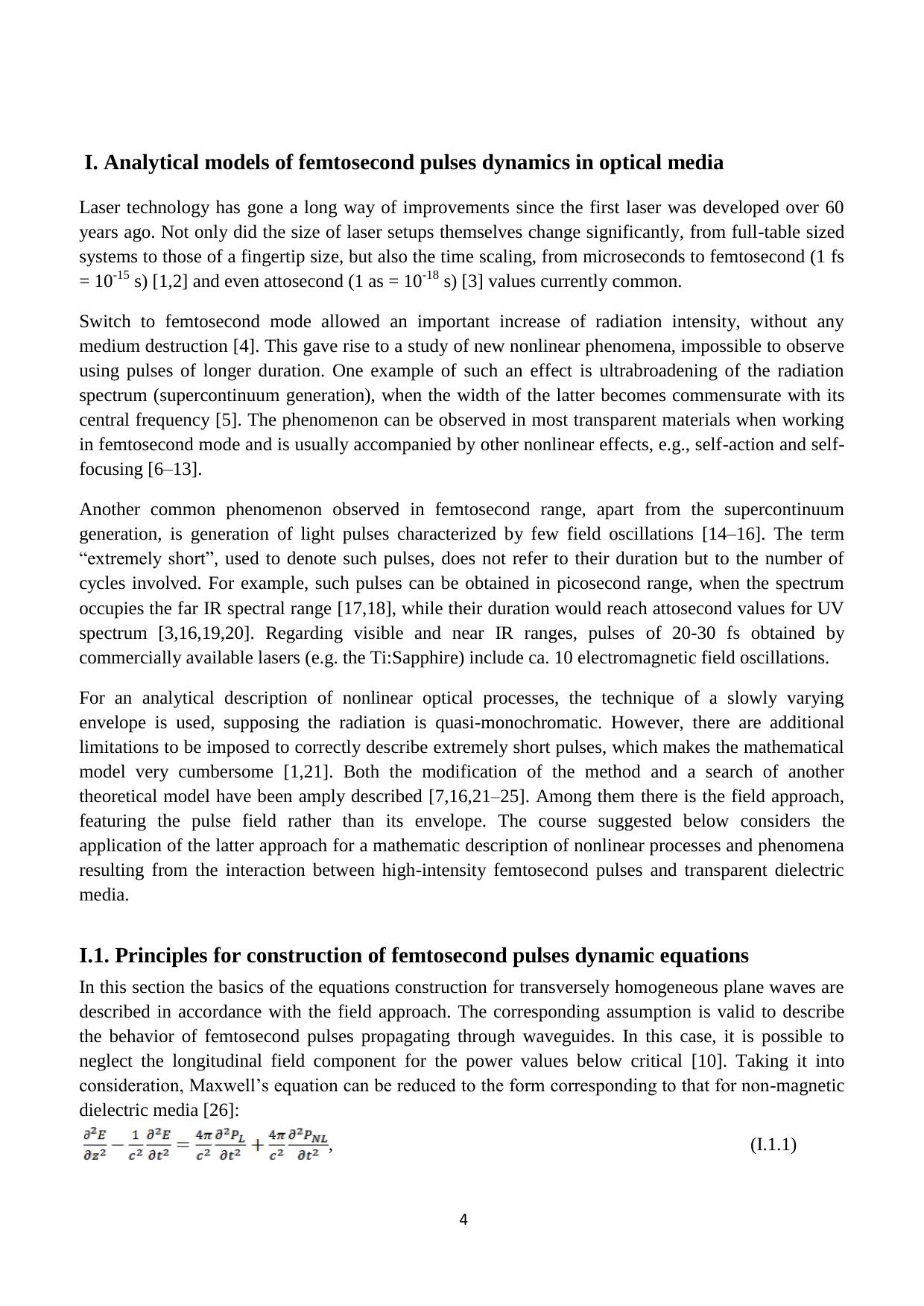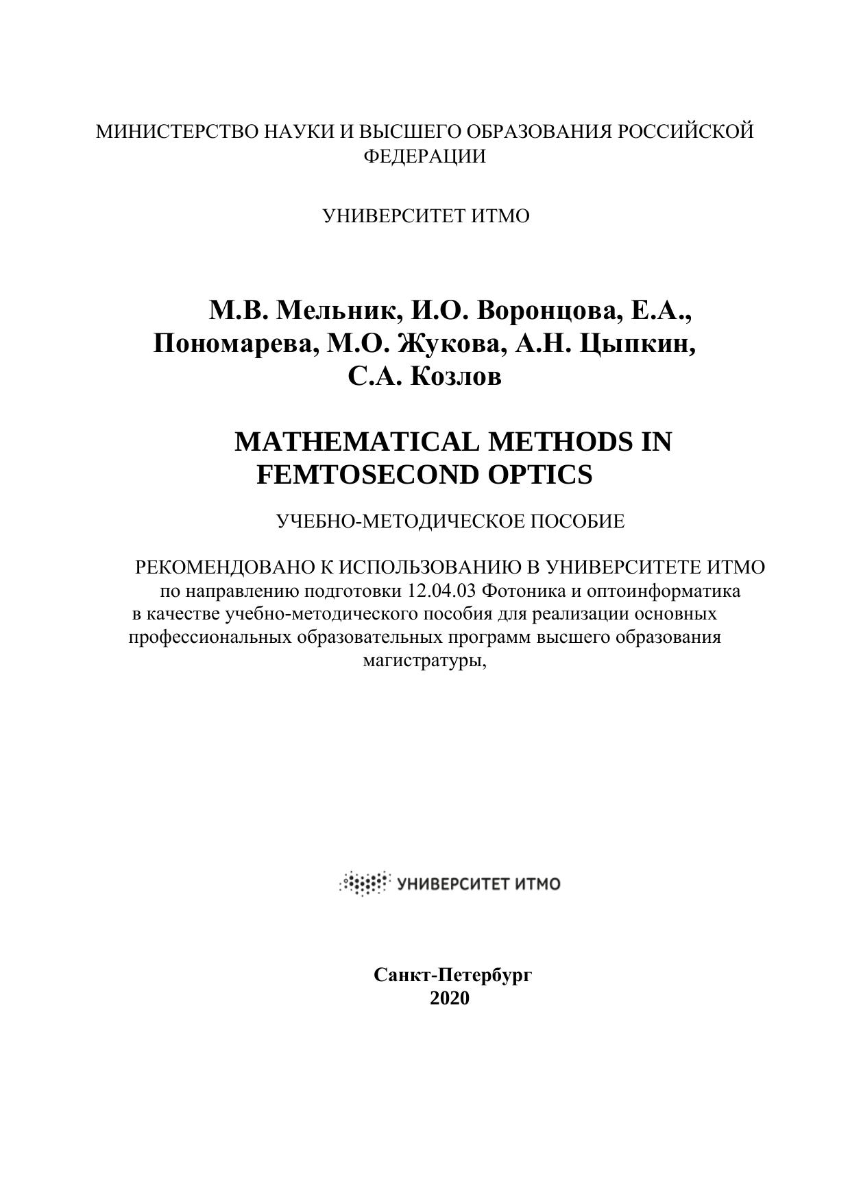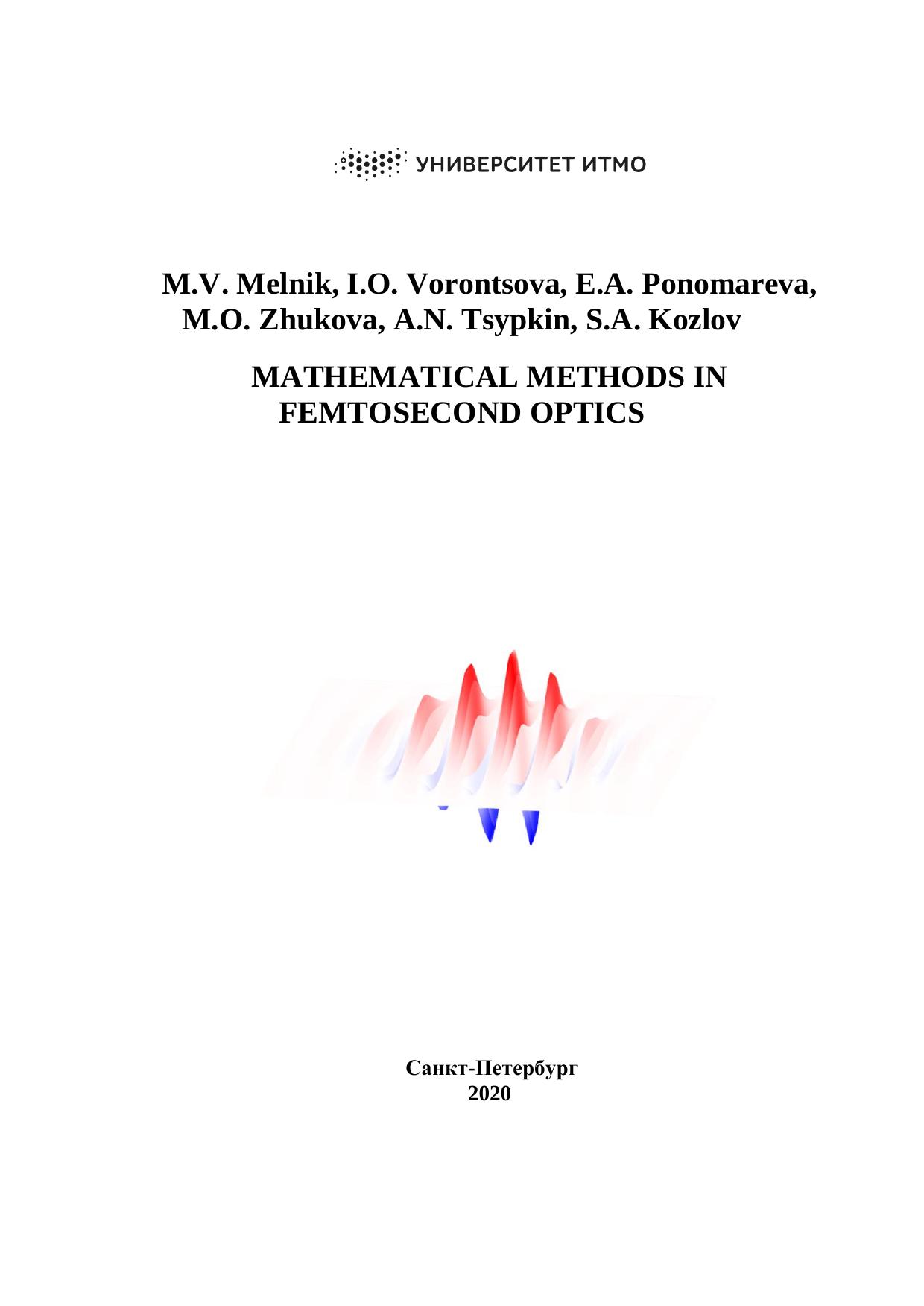 В данном методическом пособии рассматриваются основные математические методы и техники, используемые в современных научных исследованиях в области фемтосекундной и нелинейной оптики. Приведено описание математических подходов для изучения динамики фемтосекундных импульсов при их распространении в различных средах на основе полевого, спектрального подходов, а также на основе огибающих поля. Рассмотрены аналитические модели для оценки нелинейного, дисперсионного и дифракционного вкладов в отдельности в динамику фемтосекундных импульсов. Продемонстрированы основные методы численного моделирования, позволяющие описывать изученные аналитические модели. На основе представленных математических моделей описаны основные явления, возникающие при взаимодействии высокоинтенсивных фемтосекундных импульсов с веществом. Продемонстрированы аналитические модели для таких явлений как: генерация спектрального суперконтинуума, самофокусировка, генерация терагерцового излучения из плазмы. Приведены аналитические выражения для оценки нелинейности различных сред как в ИК, так и в ТГц диапазоне частот.