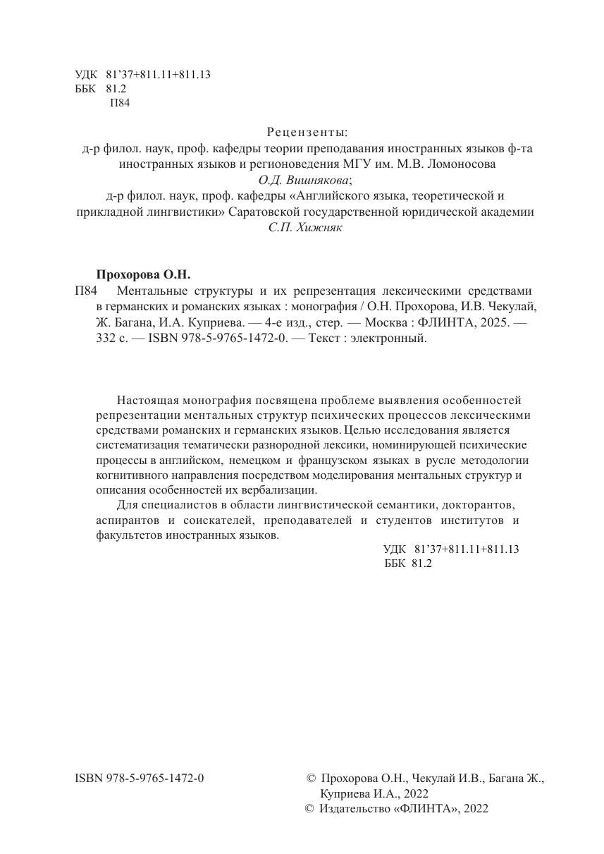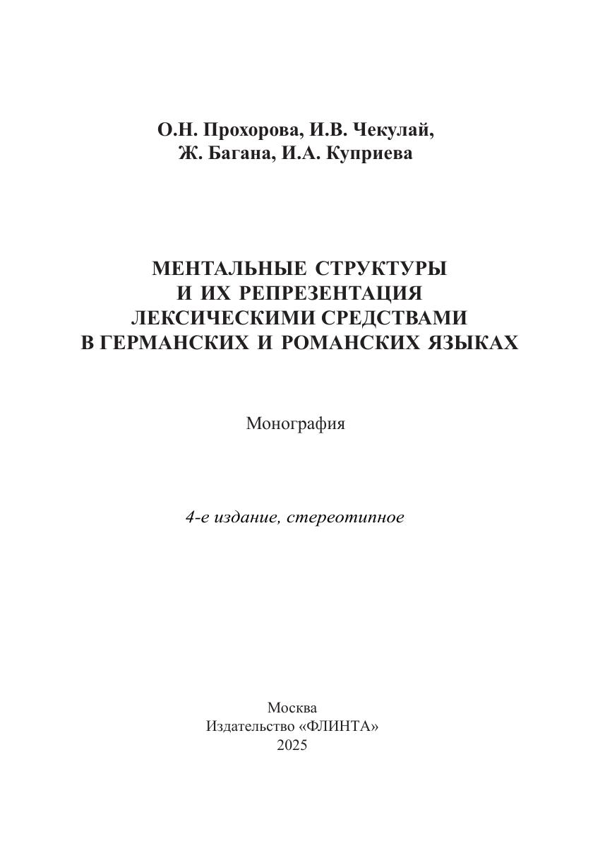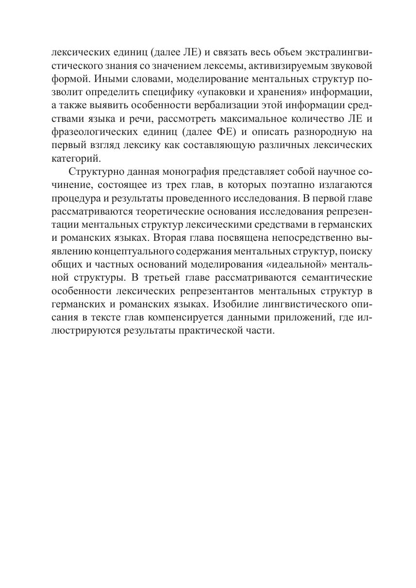 Настоящая монография посвящена проблеме выявления особенностей репрезентации ментальных структур психических процессов лексическими средствами романских и германских языков. Целью исследования является систематизация тематически разнородной лексики, номинирующей психические процессы в английском, немецком и французском языках в русле методологии когнитивного направления посредством моделирования ментальных структур и описания особенностей их вербализации. Для специалистов в области лингвистической семантики, докторантов, аспирантов и соискателей, преподавателей и студентов институтов и факультетов иностранных языков.