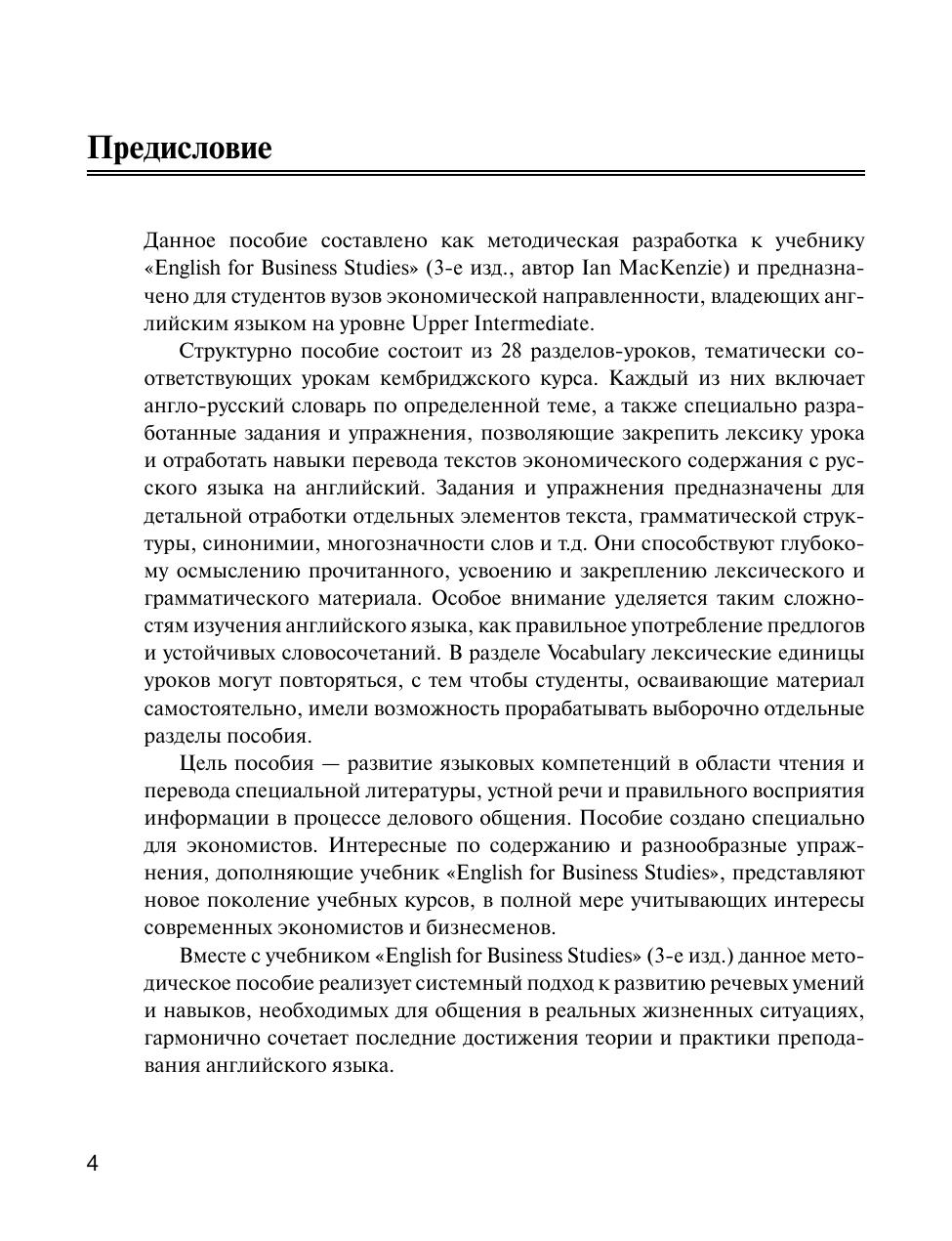 Методическое пособие разработано преподавателями кафедры английского языка факультета экономики НИУ ВШЭ в ходе занятий со студентами по учебнику «English for business studies» Издательства Кембриджского университета (Cambridge University Press). Цель создания пособия — дополнить существующий курс упражнениями и заданиями на перевод, грамматическими упражнениями, а также глоссарием с русскоязычными соответствиями. Пособие рекомендуется как дополнительный компонент к учебному курсу «English for business studies» (3-е изд.) для российских студентов-экономистов.