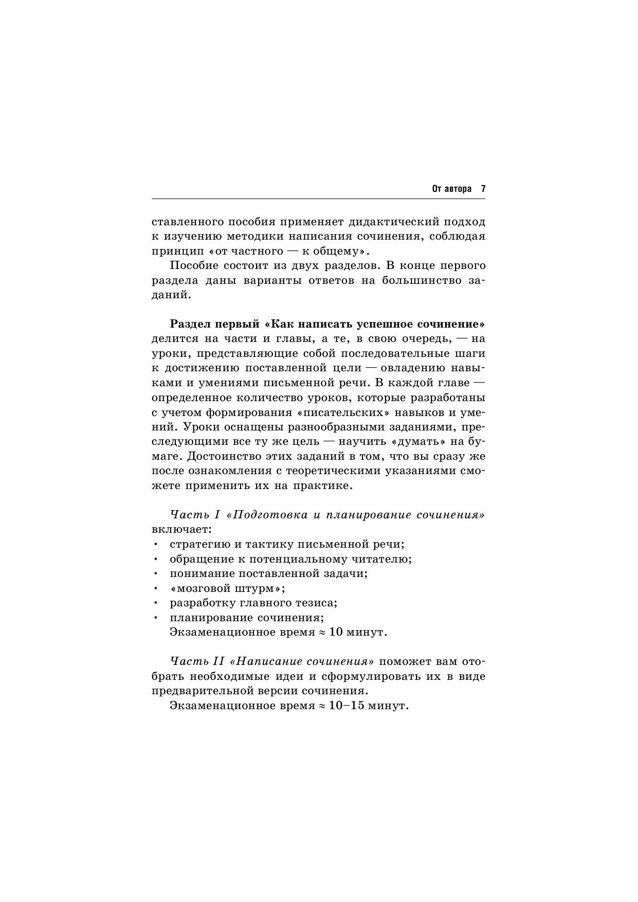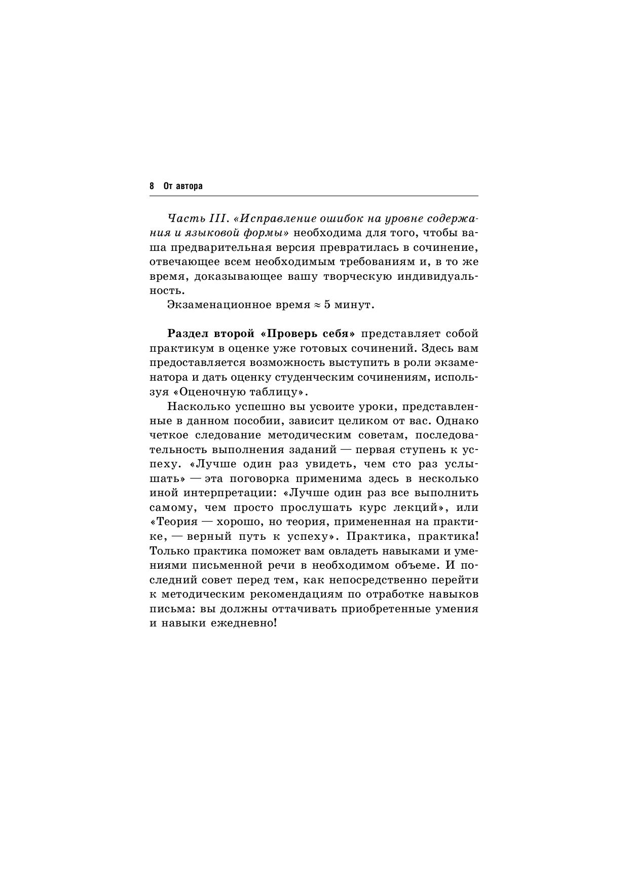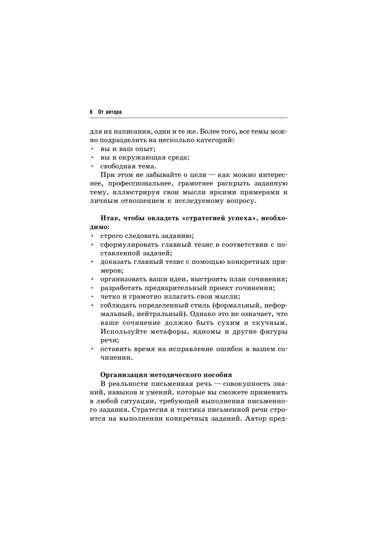 Статья, очерк, сочинение — индивидуальное творчество. Одни неплохо владеют необходимыми навыками письма и умениями письменной речи, другие испытывают трудности при написании короткого послания, не говоря уже о сочинении. Если вы принадлежите к первой группе — вам повезло, и все в ваших руках если нет, то данное пособие укажет вам путь к успеху. Методические советы, описанные в представленной книге, помогут четко и правильно организовать не только свои мысли, но и время, отведенное на написание работы. Пособие поможет выработать свой стиль, приобрести необходимые умения и навыки в таком непростом деле, как составление письменного обращения к читателям. И, не испытывая особой страсти к написанию сочинения, вы сумеете его создать, а главное — почувствуете некоторую уверенность в том, о чем раньше боялись даже подумать. Итак, смелее вперед!