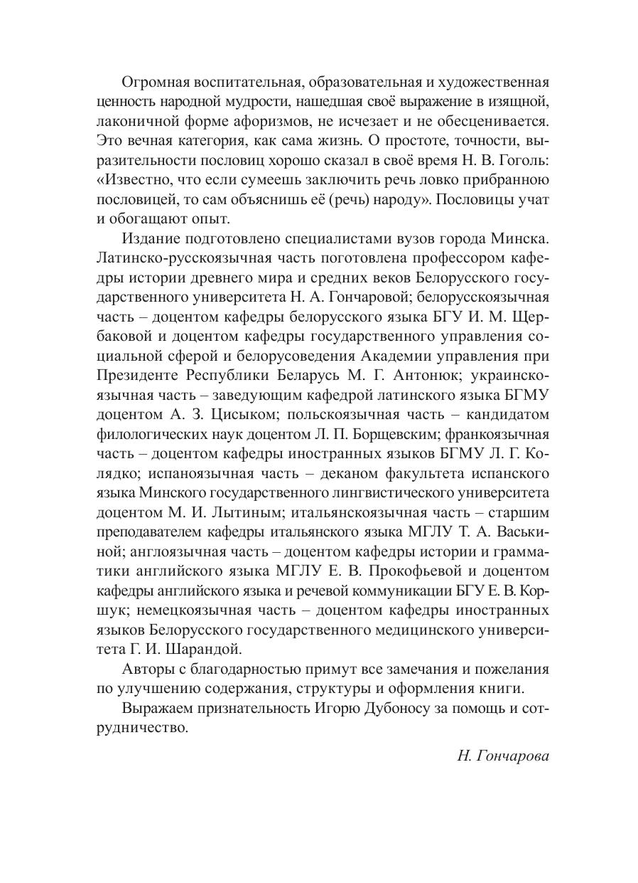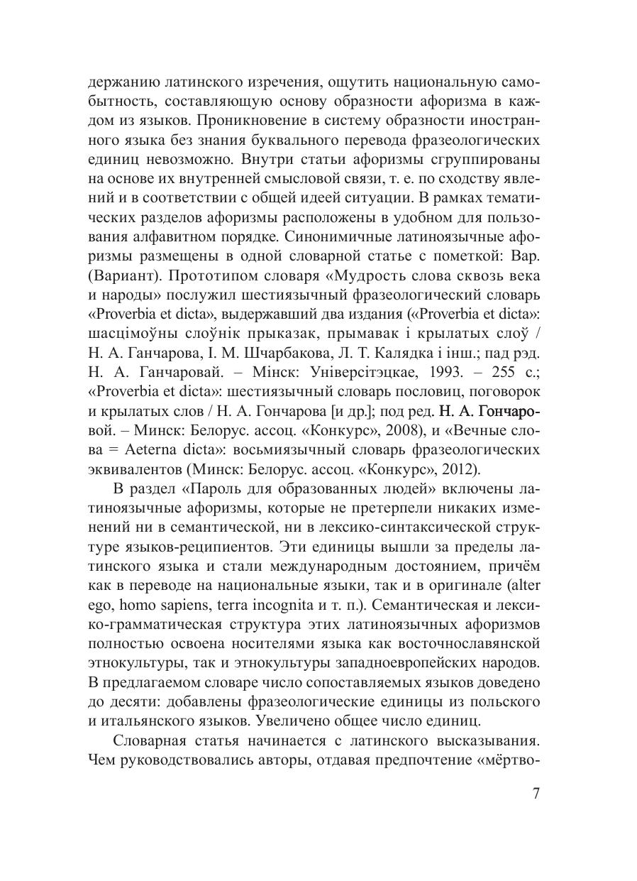 Десятиязычный словарь фразеологических эквивалентов содержит свыше 600 латинских пословиц, поговорок, изречений, систематизированных по тематическому принципу. К ним подобраны фразеологические соответствия на русском, белорусском, украинском, польском, французском, испанском, итальянском, английском и немецком языках. Прилагается указатель латинских фразеологических единиц. В основе словаря лежат шестиязычный прототип, вышедший в свет впервые в 1993 г. в издательстве «Университетское», второе издание 2008 г. – «Proverbiaet dicta: шестиязычный словарь пословиц, поговорок и крылатых слов», а также восьмиязычный словарь фразеологических эквивалентов «Вечные слова=Aeterna dicta» 2012 года издания. Для широкого круга читателей: учащихся средних и высших учебных заведений, теоретиков и практиков языка, ценителей образной речи.