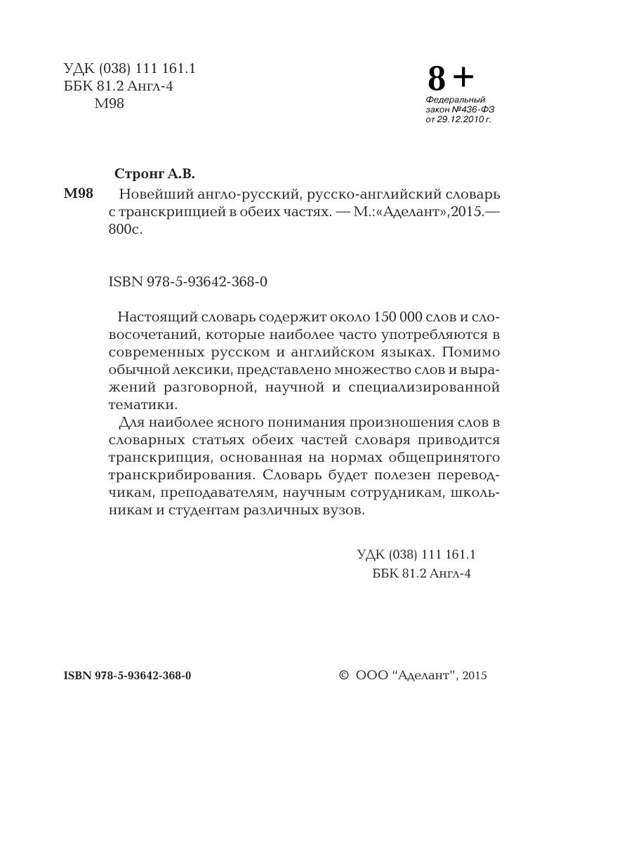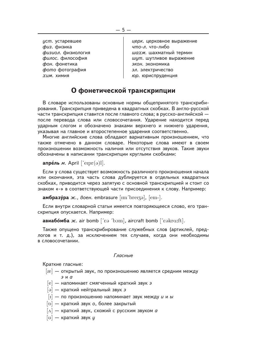 Для наиболее ясного понимания произношения слов в словарных статьях обеих частей словаря приводится транскрипция, основанная на нормах общепринятого транскрибирования. Словарь будет полезен переводчикам, преподавателям, научным сотрудникам, школьникам и студентам различных вузов.
