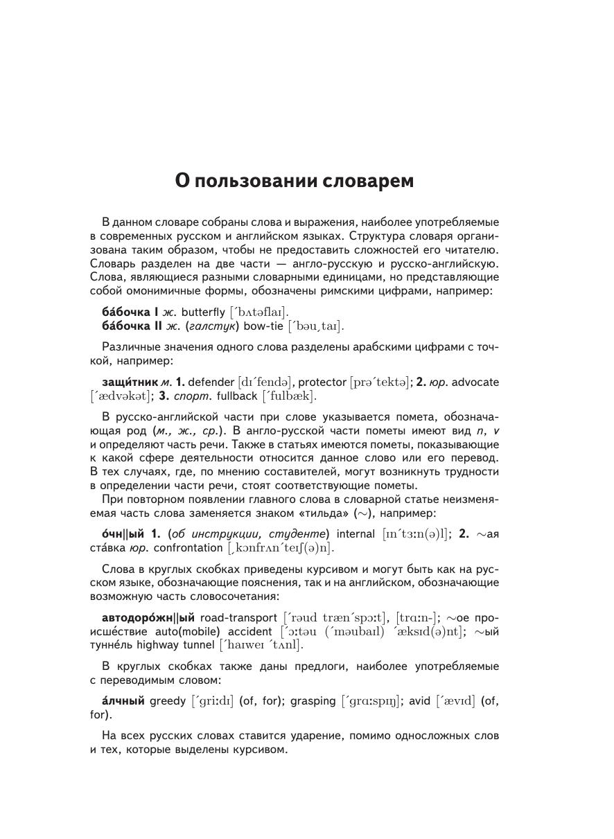 Настоящий словарь содержит около 150 000 слов и словосочетаний, которые наиболее часто употребляются в современных русском и английском языках. Помимо обычной лексики, представлено множество слов и выражений разговорной, научной и специализированной тематики.
