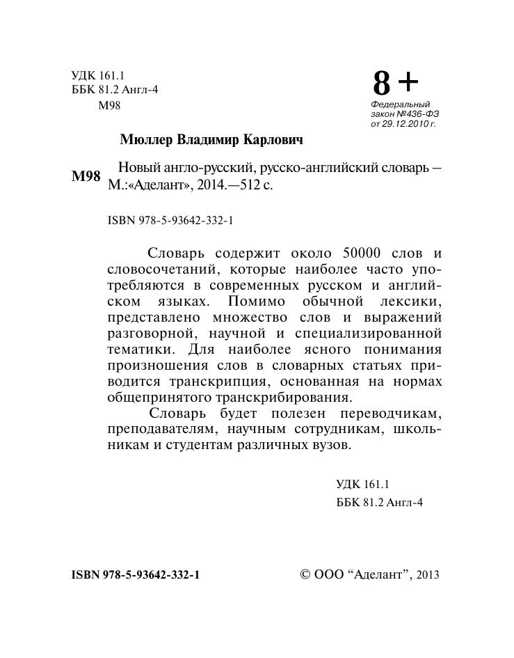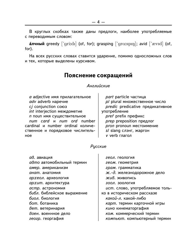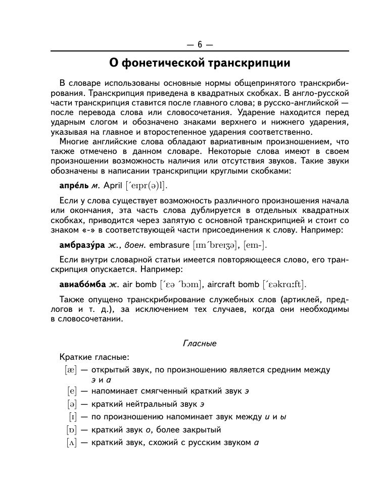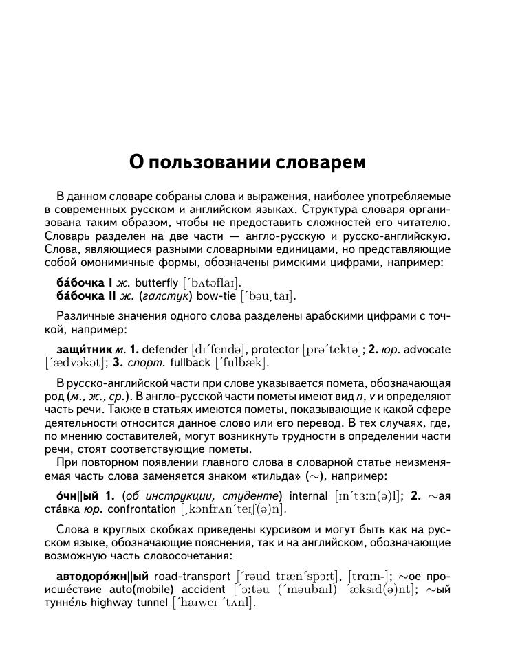 Словарь содержит около 50000 слов и словосочетаний, которые наиболее часто употребляются в современных русском и английском языках. Помимо обычной лексики, представлено множество слов и выражений разговорной, научной и специализированной тематики. Для наиболее ясного понимания произношения слов в словарных статьях приводится транскрипция, основанная на нормах общепринятого транскрибирования.