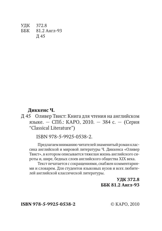 Предлагаем вниманию читателей знаменитый роман классика английской и мировой литературы Ч. Диккенса «Оливер Твист», в котором описывается тяжелая жизнь английского сироты и, шире, бедных слоев английского общества XIX века.Текст печатается с сокращениями, снабжен комментариями и словарем. Для студентов языковых вузов и всех любителей английской классической литературы.