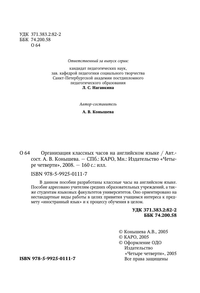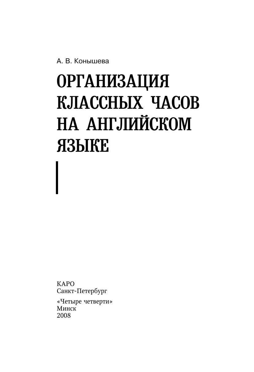 В данном пособии разработаны классные часы на английском языке. Пособие адресовано учителям средних образовательных учреждений, а также студентам языковых факультетов университетов. Оно ориентировано на нестандартные виды работы в целях привития учащимся интереса к предмету "иностранный язык" и к процессу обучения в целом.