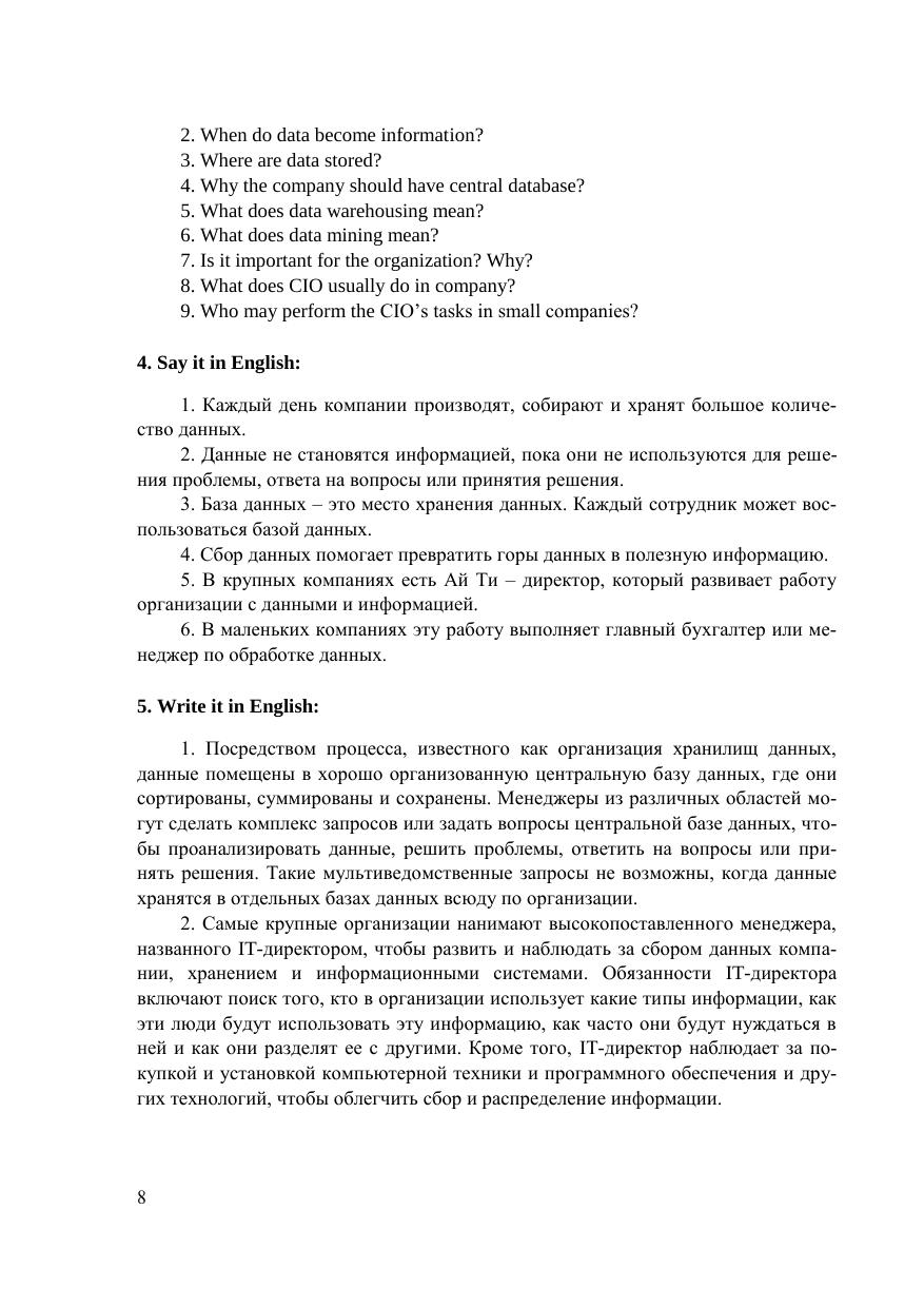 Пособие предназначено для практического освоения студентами вы-пускных курсов ФСПО программы «Английский язык» по специальности «Прикладная информатика по отраслям». Пособие состоит из двух частей. Первая часть содержит материал, направленный на активизацию навыков разговорной речи и чтения в рамках изучаемой специальности. Вторая часть – текст для чтения профессиональной направленности с упражнениями. УДК