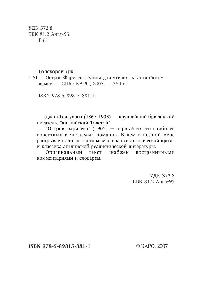 Джон Голсуорси (1867–1933) — крупнейший британский писатель, «английский Толстой». «Остров фарисеев» (1903) — первый из его наиболее известных и читаемых романов. В нем в полной мере раскрывается талант автора, мастера психологической прозы и классика английской реалистической литературы. Оригинальный текст снабжен постраничными комментариями и словарем.