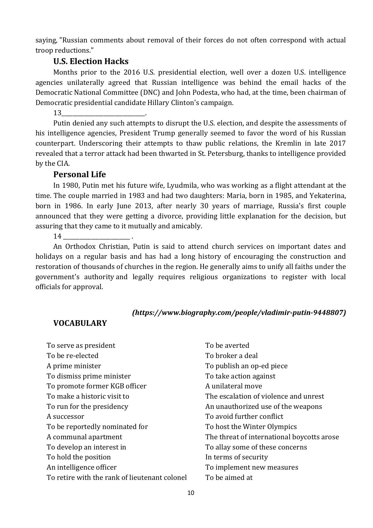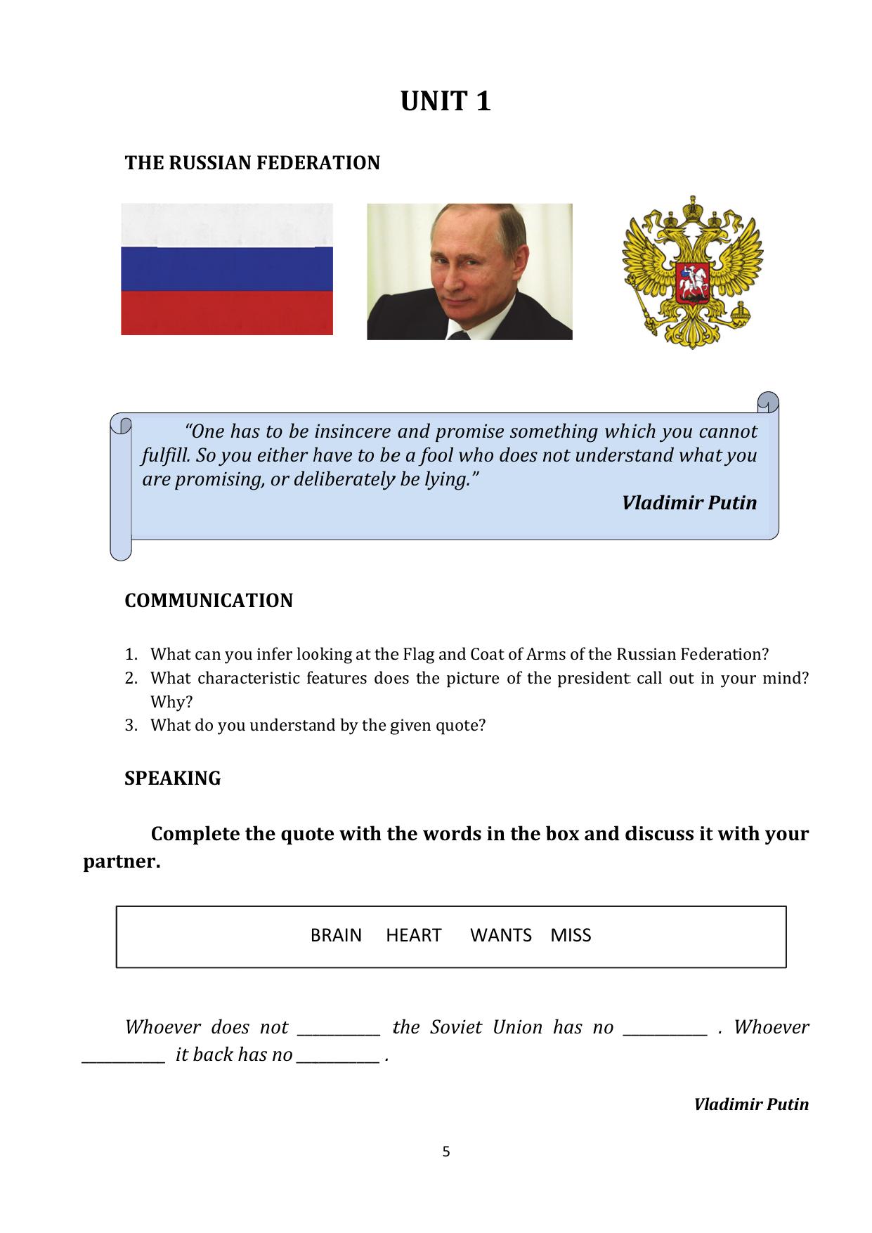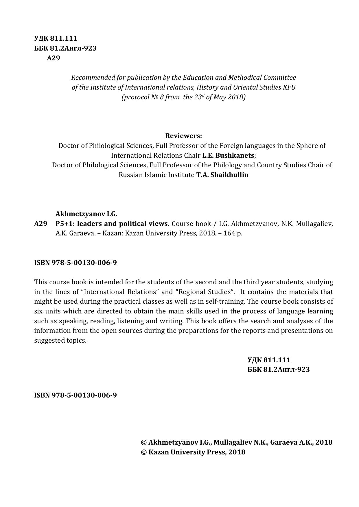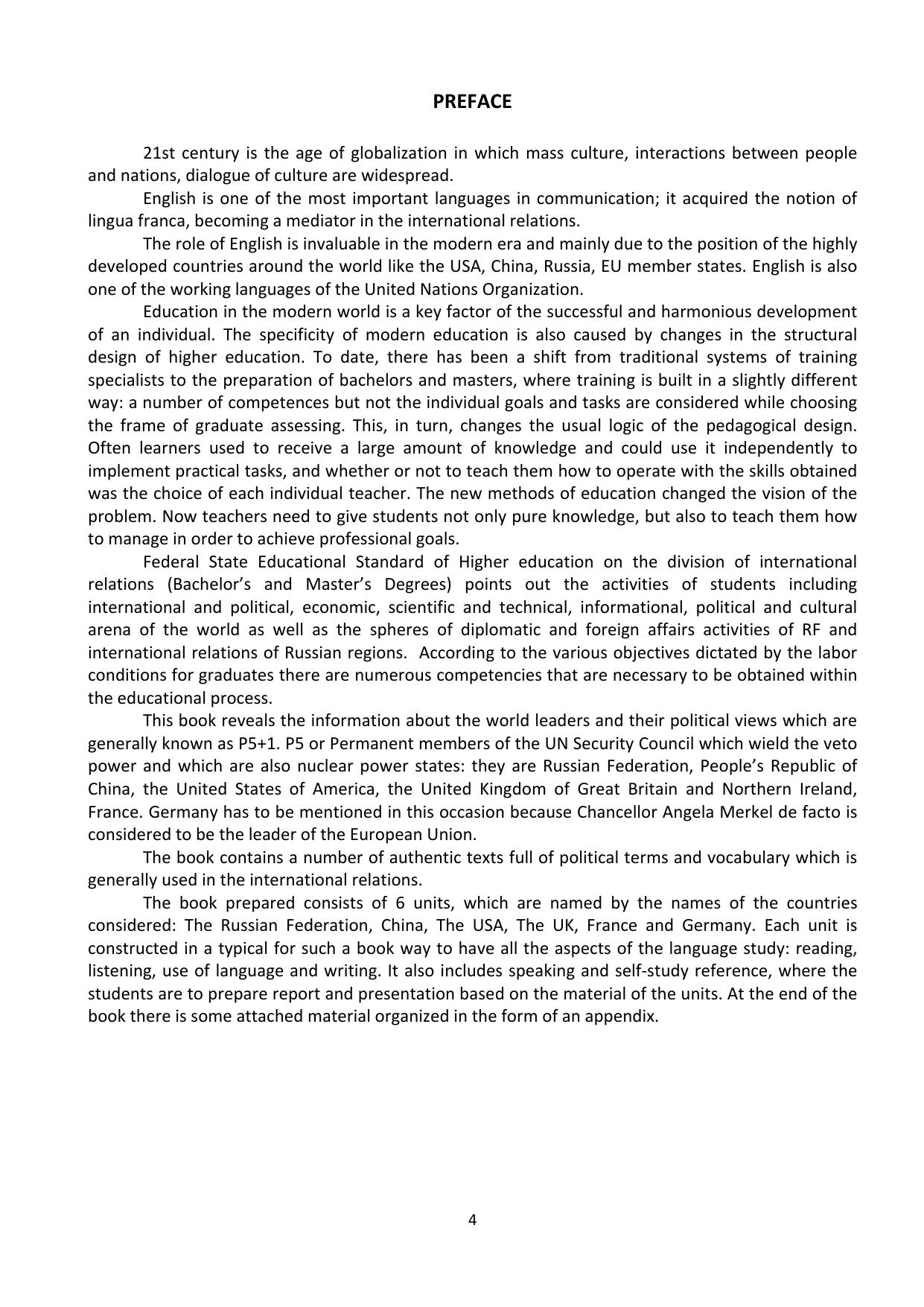 This course book is intended for the students of the second and the third year students, studying in the lines of “International Relations” and “Regional Studies”. It contains the materials that might be used during the practical classes as well as in self-training. The course book consists of six units which are directed to obtain the main skills used in the process of language learning such as speaking, reading, listening and writing. This book offers the search and analyses of the information from the open sources during the preparations for the reports and presentations on suggested topics.