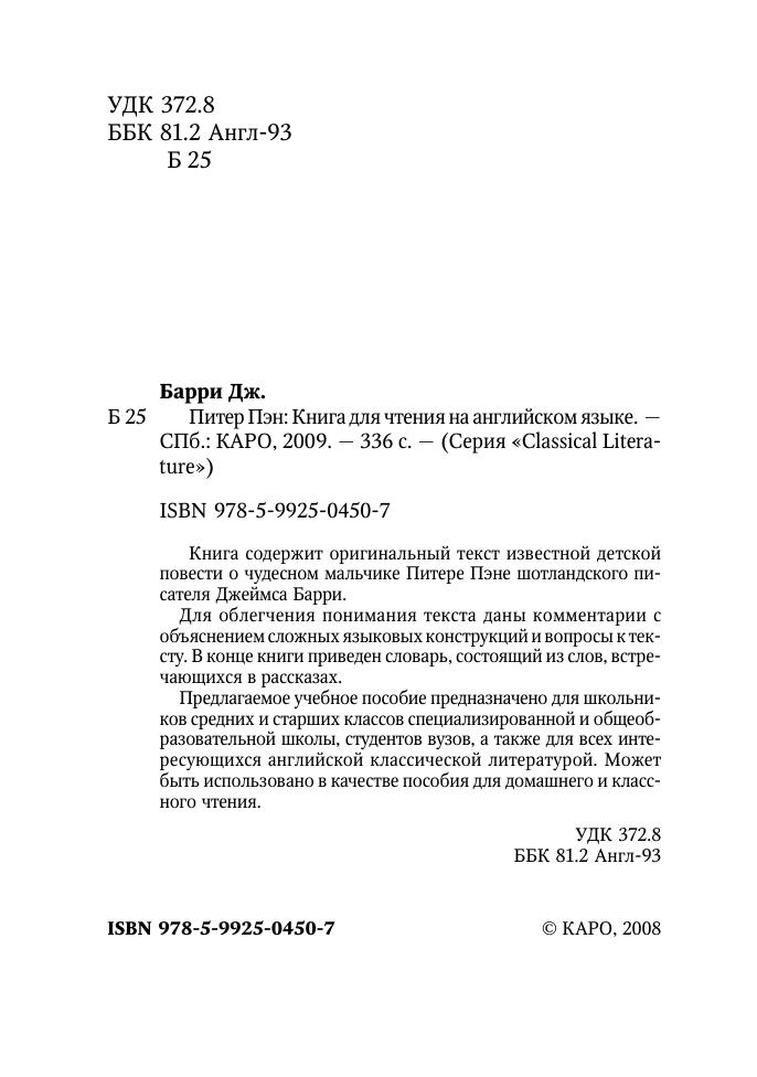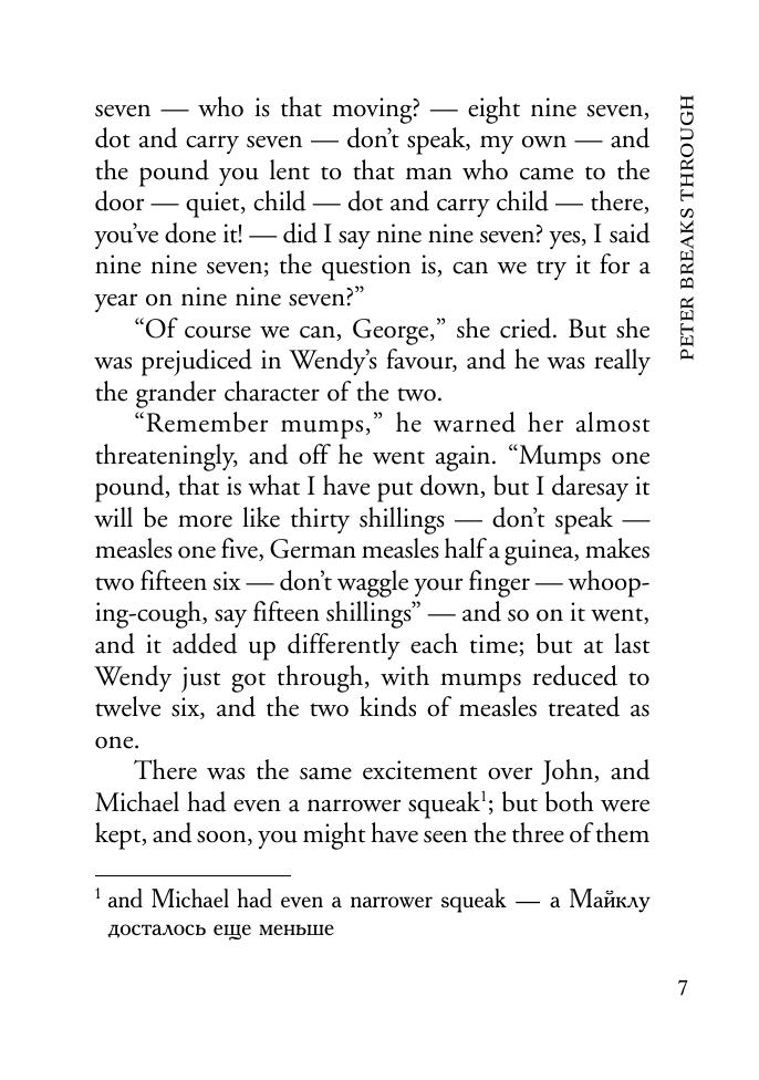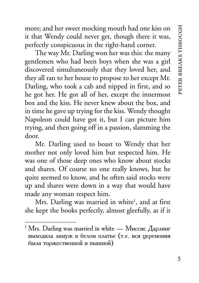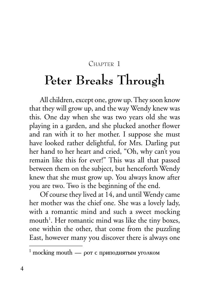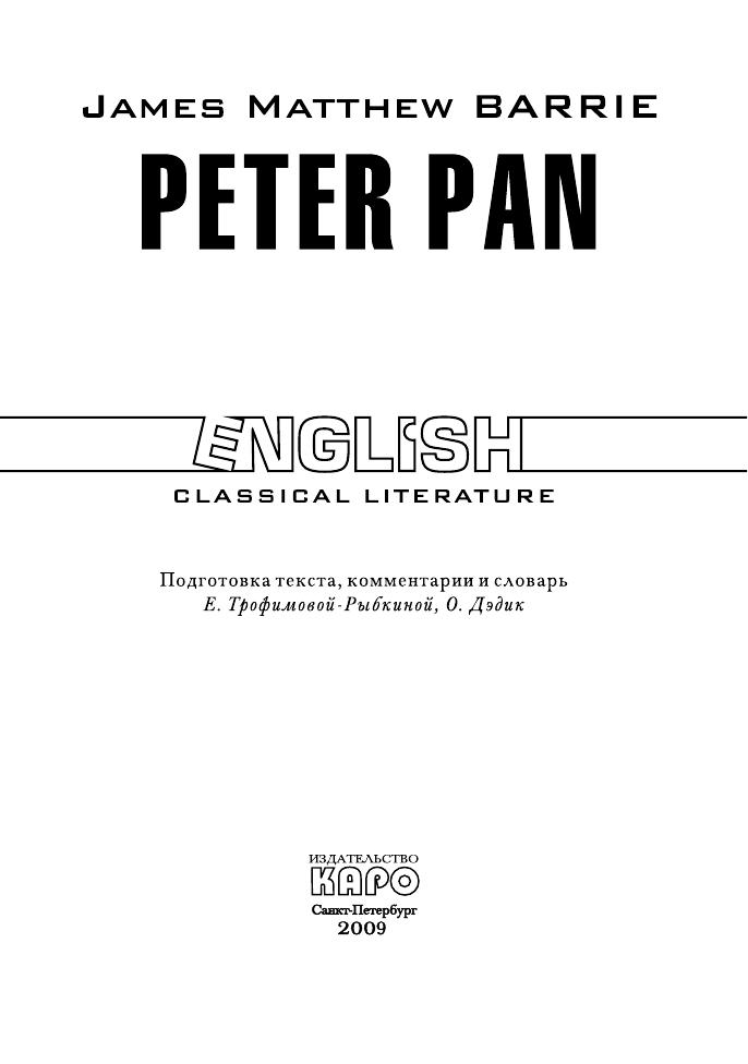 Книга содержит оригинальный текст известной детской повести о чудесном мальчике Питере Пэне шотландского писателя Джеймса Барри. Для облегчения понимания текста даны комментарии с объяснением сложных языковых конструкций и вопросы к тексту. В конце книги приведен словарь, состоящий из слов, встречающихся в рассказах. Предлагаемое учебное пособие предназначено для школьников средних и старших классов специализированной и общеобразовательной школы, студентов вузов, а также для всех интересующихся английской классической литературой. Может быть использовано в качестве пособия для домашнего и классного чтения.