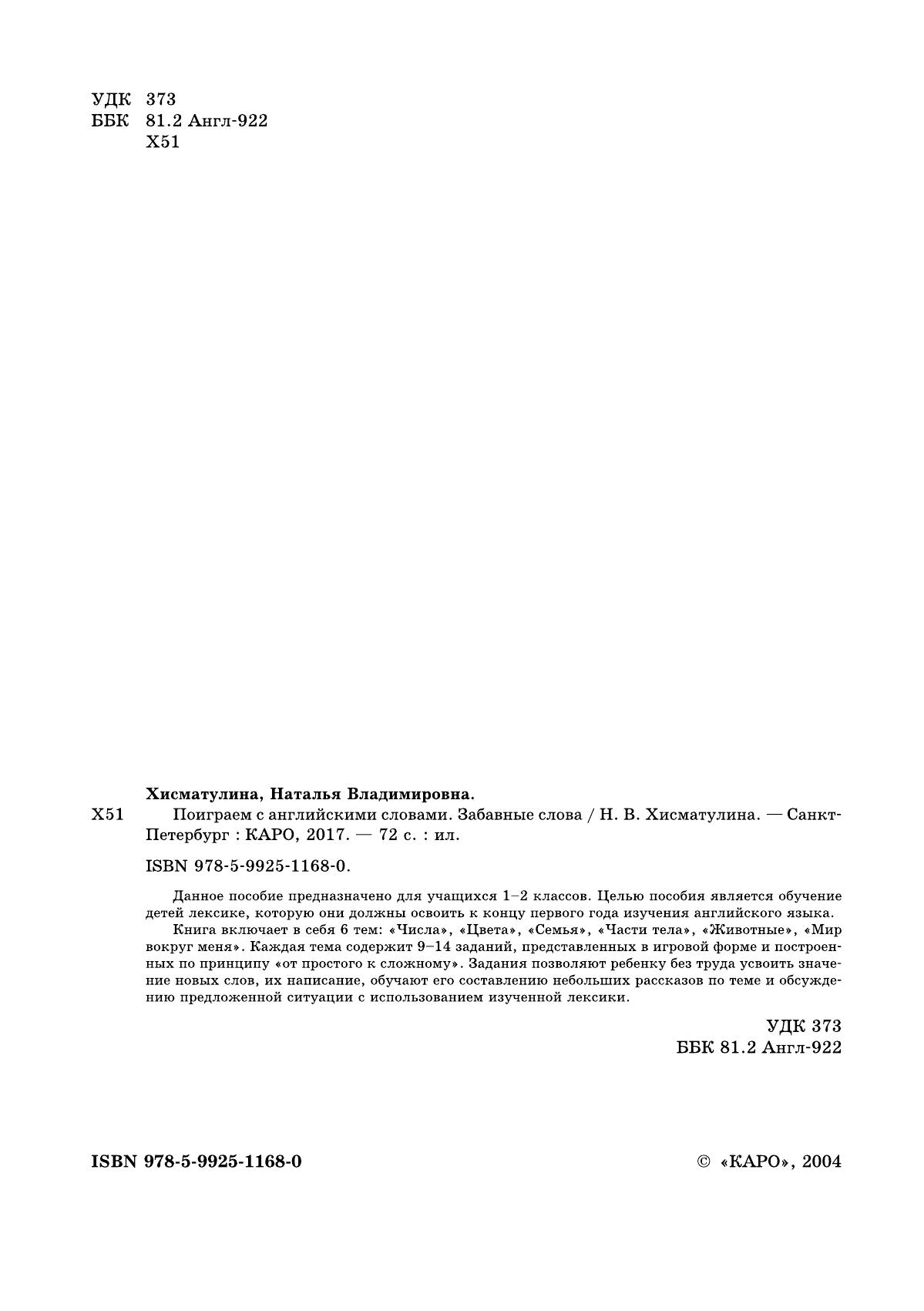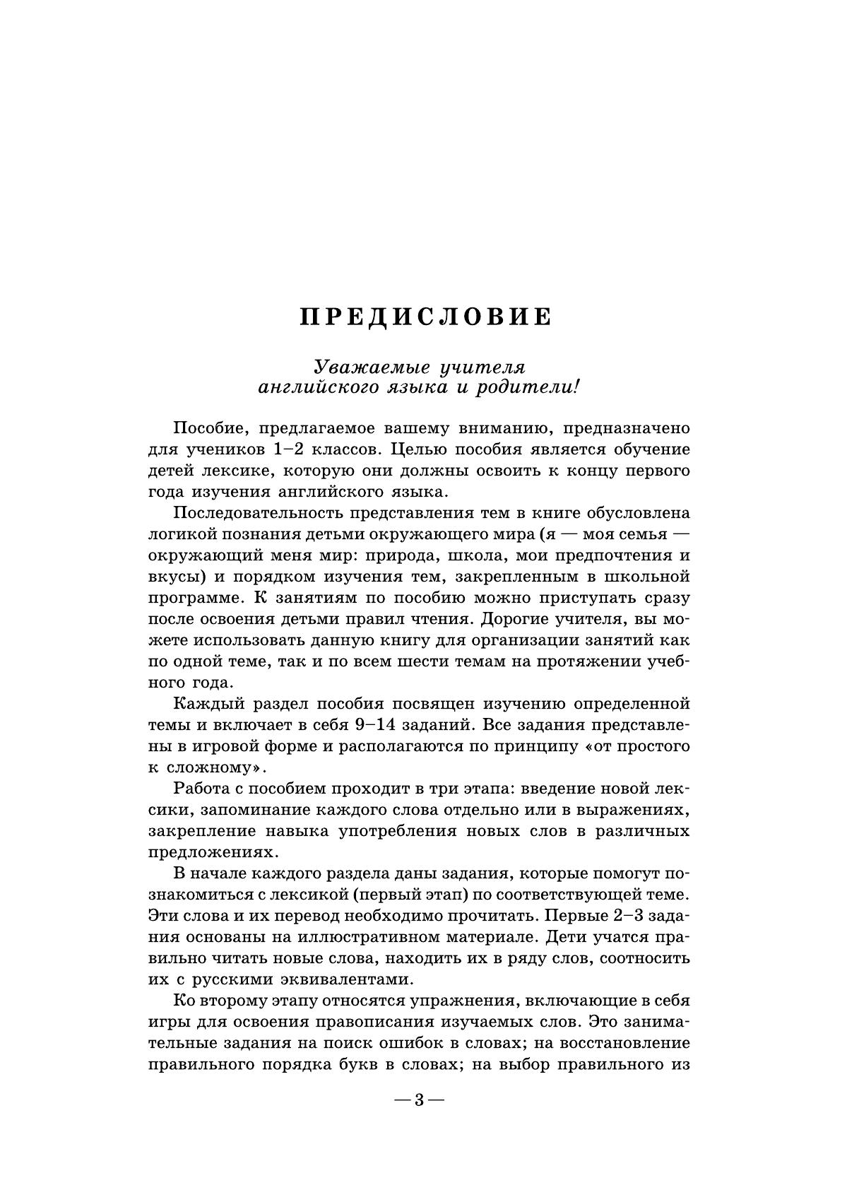 Данное пособие предназначено для учащихся 1-2 классов. Целью пособия является обучение детей лексике, которую они должны освоить к концу первого года изучения английского языка. Книга включает в себя 6 тем:" Числа", "Цвета", "Семья", "Части тела", "Животные", "Мир вокруг меня". Каждая тема содержит 9-14 заданий, представленных в игровой форме и построенных по принципу "от простого к сложному". Задания позволяют ребенку без труда усвоить значение новых слов, их написание, обучают его составлению небольших рассказов по теме и обсуждению предложенной ситуации с использованием изученной лексики.