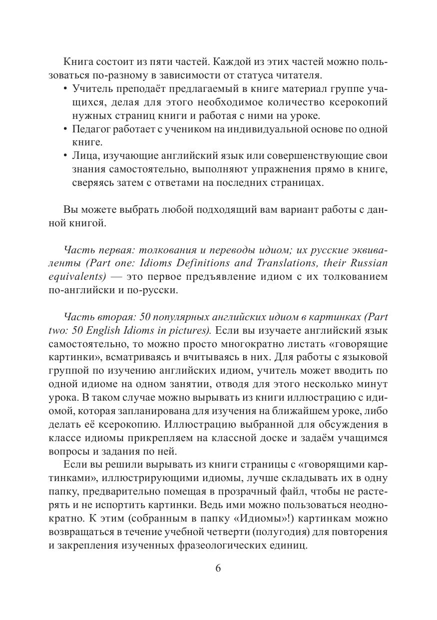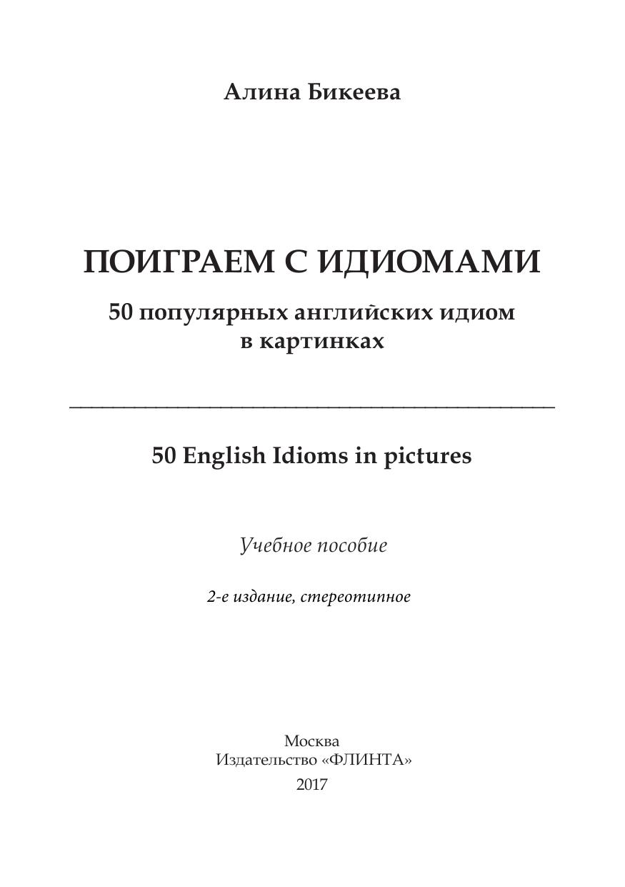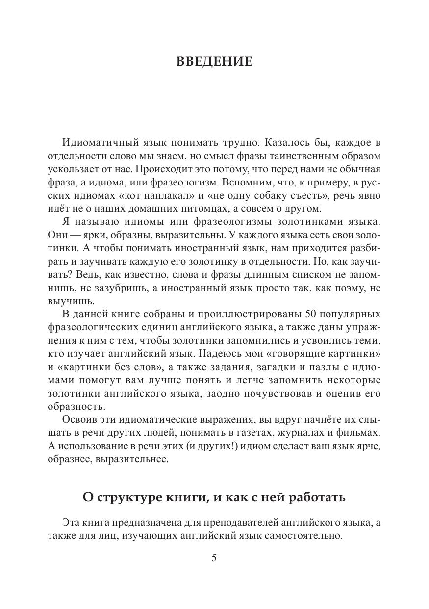 Идиома или фразеологизм — это фраза, значение которой отличается от значений входящих в нее отдельных слов. Идиомы или фразеологизмы есть в любом языке. Они ярки, образны, выразительны. В данном учебном пособии собраны и проиллюстрированы 50 популярных идиом английского языка, а также даны упражнения, выполнение которых будет способствовать запоминанию фразеологизмов теми, кто изучает английский язык. Различные задания и