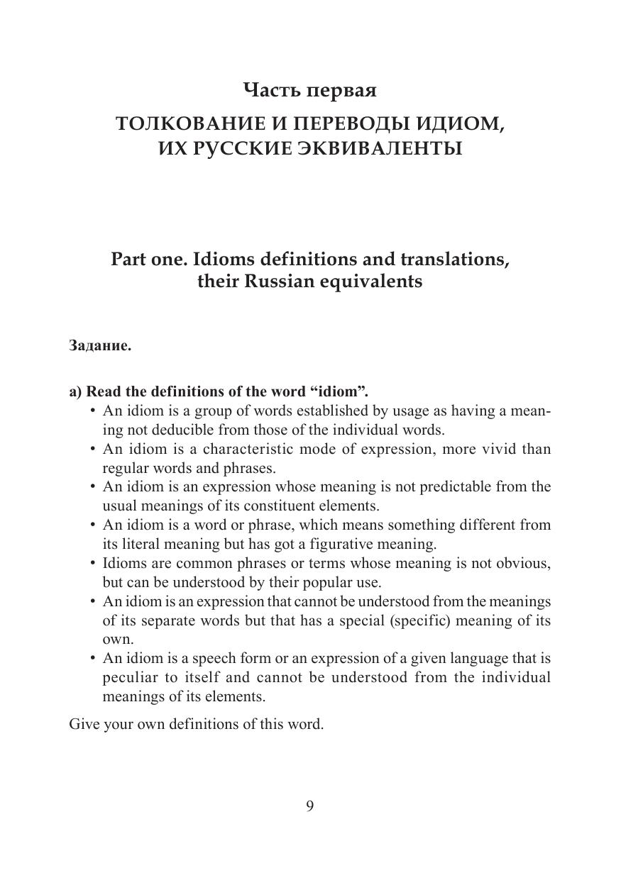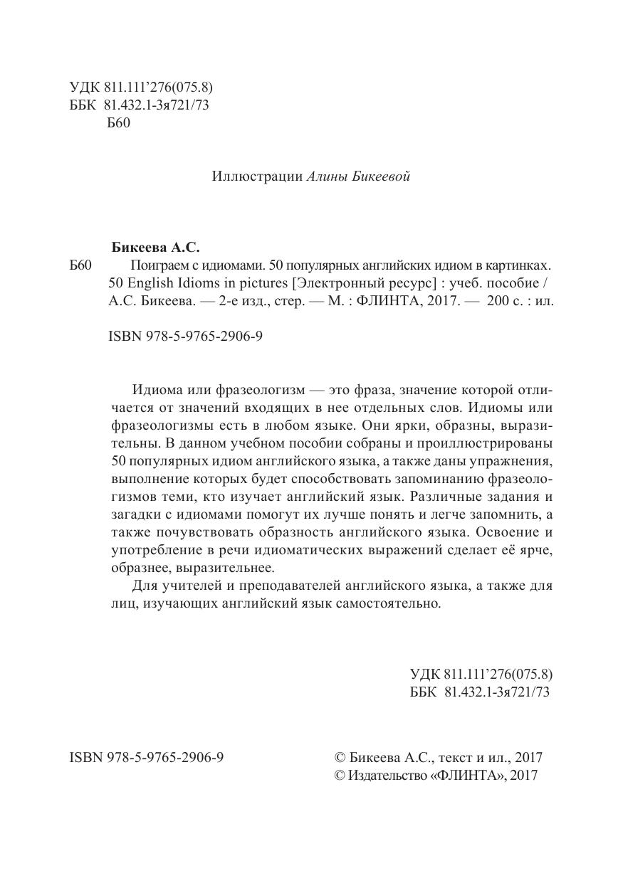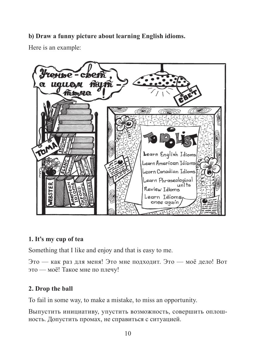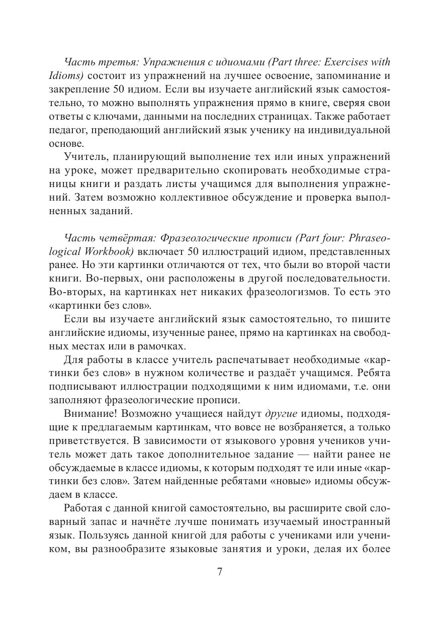 Идиома или фразеологизм — это фраза, значение которой отличается от значений входящих в нее отдельных слов. Идиомы или фразеологизмы есть в любом языке. Они ярки, образны, выразительны. В данном учебном пособии собраны и проиллюстрированы 50 популярных идиом английского языка, а также даны упражнения, выполнение которых будет способствовать запоминанию фразеологизмов теми, кто изучает английский язык. Различные задания и