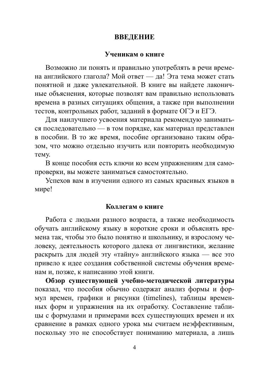 Книга написана простым, доступным языком и подойдет для школьников (в том числе при подготовке к ОГЭ и ЕГЭ) и студентов, для любого уровня обучения — от Elementary до Advanced. В то же время, пособие может быть полезным и для специалистов, поскольку охватывает весь спектр значений времен английского глагола. Пособие содержит 200 упражнений на отработку времен, ключи даны ко всем упражнениям, что даёт возможность заниматься самостоятельно.